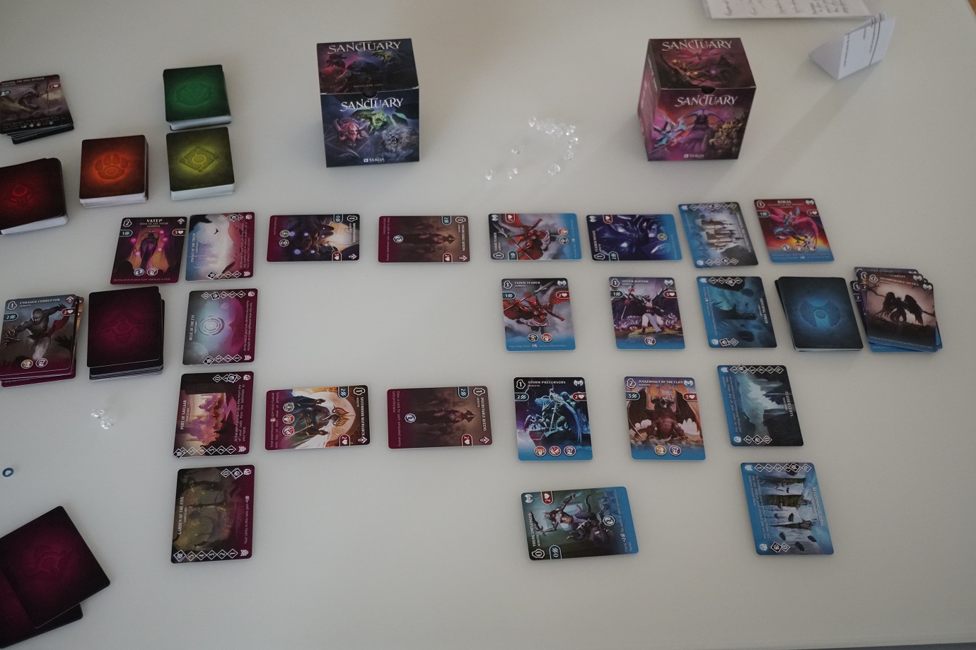 Il s’agit du dernier jeu de Tabula Games (Mysthea, Volfyrion, Icaion, Barbarians) qui a déjà prouvé son savoir-faire par ces petites bombes ludiques. De ces jeux, Volfyrion est le plus proche de Sanctuary puisqu’il s’agit également d’un jeu pour 2 joueuses bien que Sanctuary propose également un mode solo.