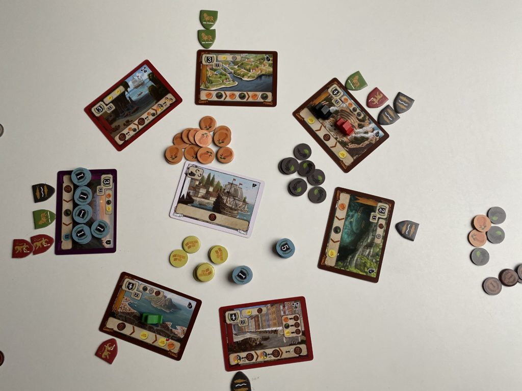 Globalement, on assiste un peu à une course à l’investissement. Et investir seul, ou au moins en premier, dans certaines îles facilitera la victoire. Ce qui aura tendance à rendre le jeu assez linéaire. En effet, les joueurs auront tendance à investir d’abord dans certaines îles avant de passer aux autres, récoltant du coup les mêmes ressources nécessaires. D’un autre côté, chaque joueur n’a que 8 blasons pour investir. Les joueurs ne pourront donc pas investir partout et espérer gagner les majorités en fin de partie. Discovery, L’Age des Découvertes est donc bien un petit jeu accessible, facile à emporter et à sortir.