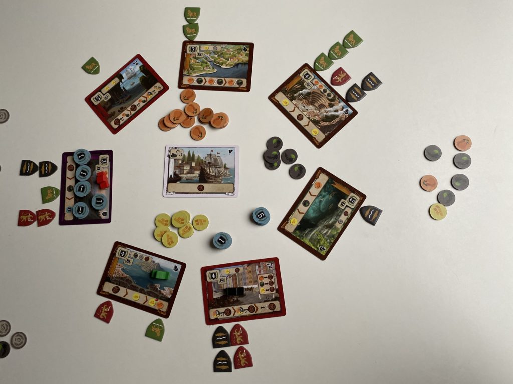 A son tour, le joueur doit déplacer son bateau, toujours dans le même sens. S’il veut changer le sens de rotation, il doit effectuer un déplacement vers l’île centrale. Les deux premières cartes sont gratuites, toute carte supplémentaire coûte une pièce au joueur. Sur la carte d’arrivée, il doit payer une taxe aux autres joueurs présents, s’il y en a. Il peut ensuite bénéficier du revenu de l’île et peut ensuite investir. Investir est intéressant car cela augmente le revenu de l’île pour le joueur. Investir est primordial car un décompte de majorité a lieu en fin de partie. Une partie peut être assez courte, disons 30 minutes, ou un peu plus longue. La durée dépendra souvent des carte Ile présentes. Certaines configurations facilitent les investissement et accélèrent ainsi la partie.