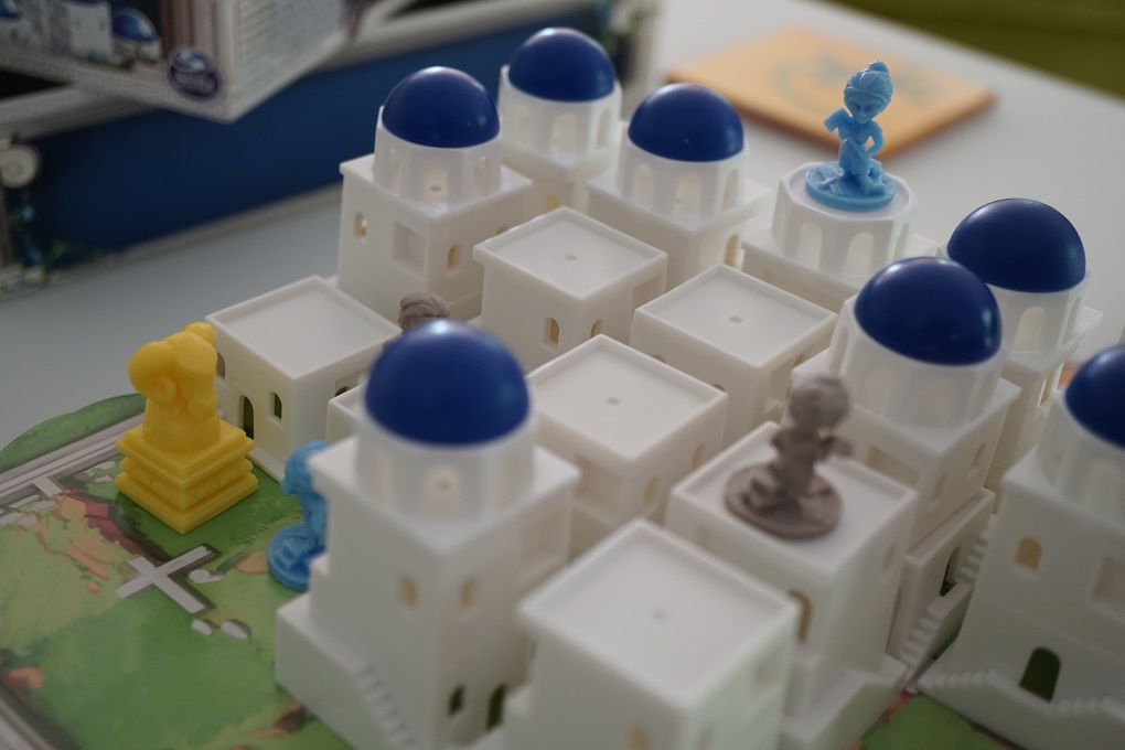 Elle apporte également une nouvelle figurine: le bélier Chrysomallos 😉 Quand on décide de jouer avec lui, on tire au sort une des 6 cartes divinités de la Toison d’Or. Les joueurs pourront bénéficier du pouvoir de cette divinité que s’ils possèdent un ouvrier adjacent au bélier Chrysomallos. Et pour ne pas embrouiller le tout ni permettre des combos trop puissantes, les joueurs ne reçoivent alors pas de carte divinité. Je n’ai pas trop apprécié cette nouvelle formule qui va en général bloquer un de vos 2 ouvriers près du bélier alors que l’autre s’attèlera à la tâche tout seul. Mais la situation n’est pas tenable longtemps et les joueurs devront un moment sacrifier le bénéfice du pouvoir Chrysomallien 😉 pour permettre à leur second ouvrier de bouger. Cette nouvelle façon de jouer à Santorini est à réserver exclusivement au jeu à 2 joueurs. Personnellement, je préfère jouer avec les cartes divinités classiques qu’avec le bélier Chrysomallos.