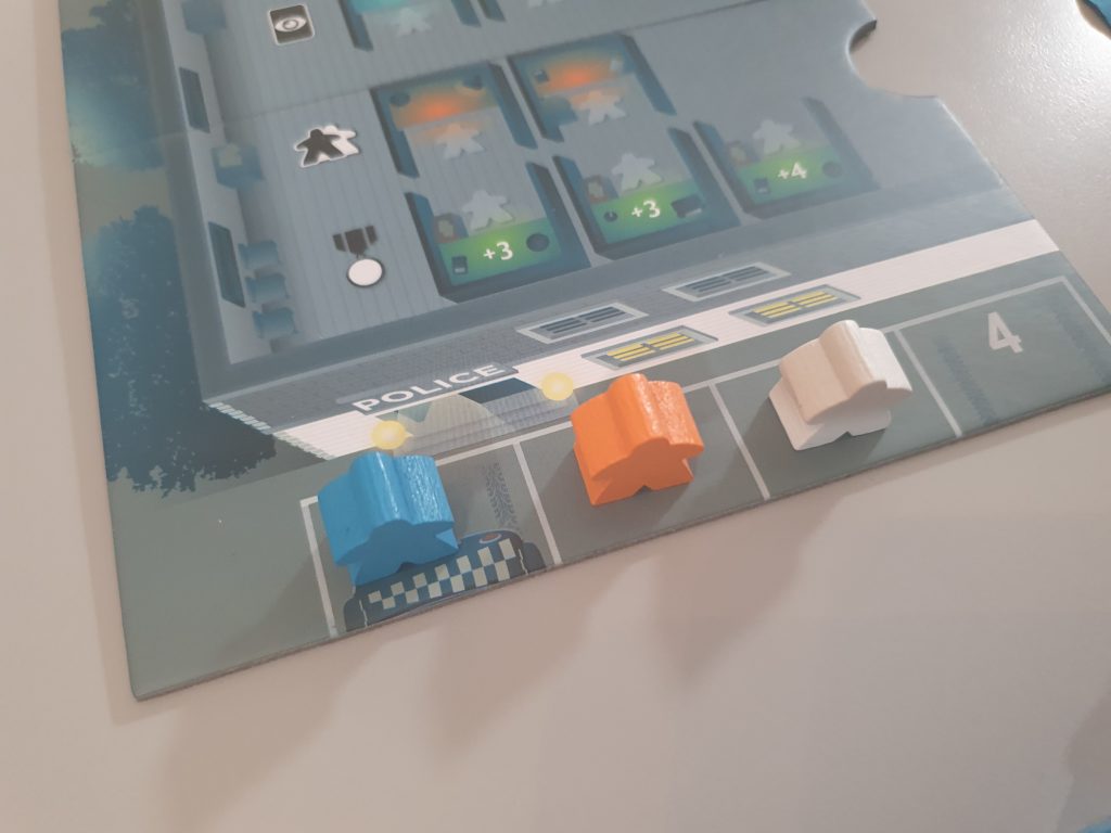 Le joueur qui a le numéro de chambre le plus élevé place un de ses meeples sur la voiture de police. Il sera donc désormais le premier joueur. Celui qui a mis le numéro le plus petit, se place complètement à droite sur le parking et les autres dans l’ordre entre les deux.