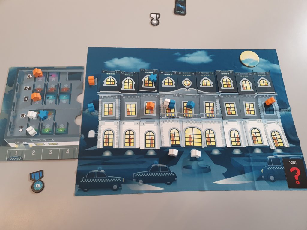 Chaque joueur reçoit ensuite 6 cartes de chambres et 5 meeples. Parmi celles qui restent, on en place une sur le côté face cachée, ce sera celle qui abrite le criminel. Les autres sont déjà placées sur l’hôtel venant éclairer les fenêtres. Ces chambres sont donc innocentes.