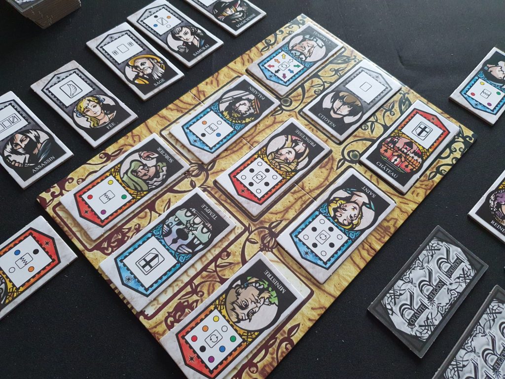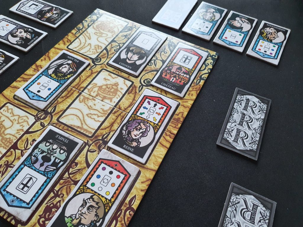 Le principe est assez simple. Chacun pose une tuile personnage sur un plateau à 9 emplacements. Chacune des pièces aura un sens qui indiquera si c’est un allié (tourné vers soi) ou un ennemi (tourné à l’envers). Ainsi, ses propres pièce du départ peuvent changer de camp par un simple retournement.