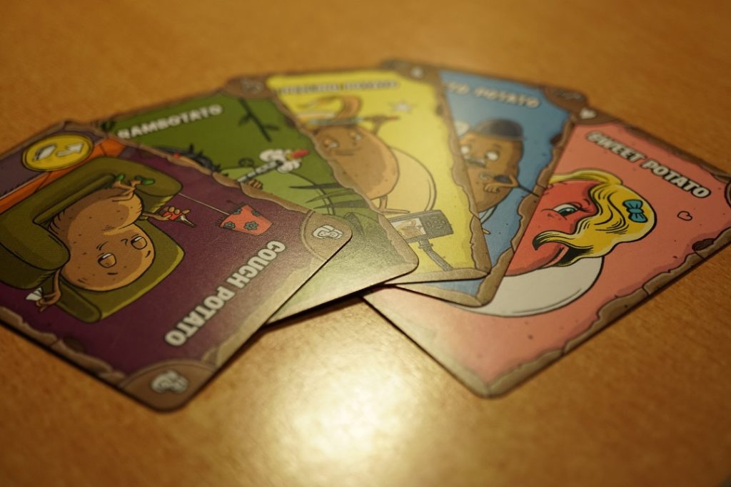 Chaque joueuse dispose d’une même main de 6 cartes patate. Les 6 mêmes: Couch Potato, Rambotato, A-Peeling Potato, Poteto Potato, Sweet Potato et Robotato. Chaque carte patate montre un des 6 symboles du jeu dans ses coins.