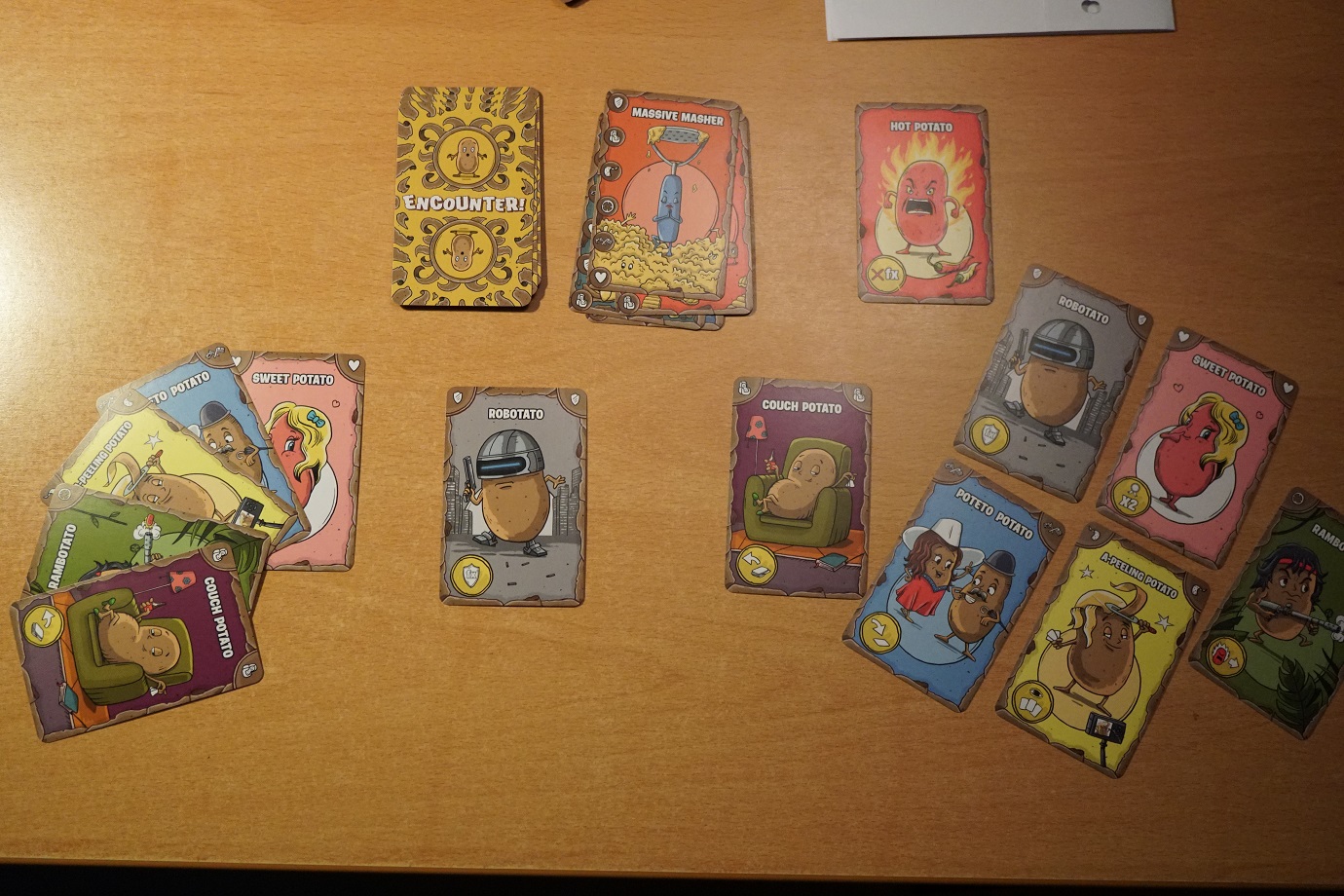 On va mélanger la pioche des cartes rencontre et on va tirer les 3 premières au hasard. Ces cartes vont montrer une « hérarchie » de symboles, du plus fort au plus faible. Ces symboles sont les mêmes que ceux sur les cartes patate. L’objectif sera de jouer une carte patate dont le symbole est le plus fort sur la carte rencontre tirée par rapport aux cartes de ses adversaires. On va ensuite mélanger les 3 cartes rencontre tirées entre elles et les placer au-dessus de la pioche. On connait donc les 3 prochaines cartes de la pioche mais pas leur ordre d’arrivée.