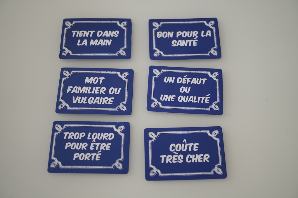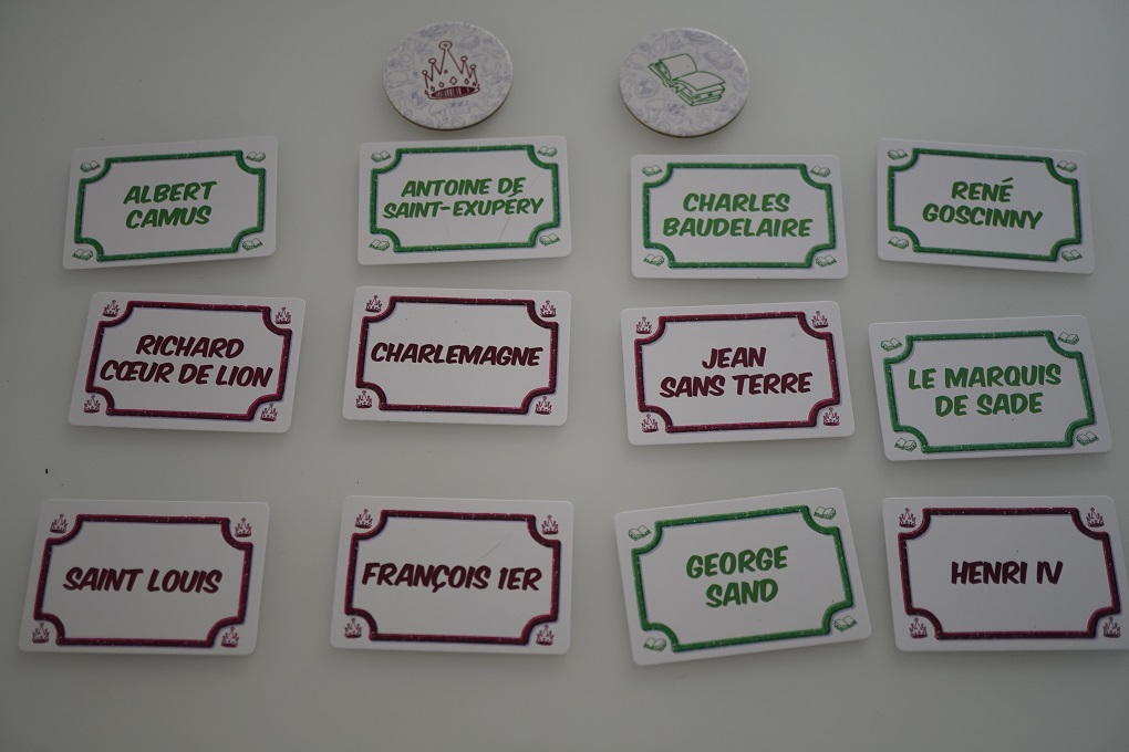 Le dernier module consiste en une série de novelles cartes personnage réparties en 6 thèmes: rois et reines, littérature, musique,… Au début de la partie, on va tirer au hasard 2 thèmes et on mélangera les cartes de ces 2 thèmes pour la partie. Les joueurs seront donc amenés à devoir découvrir des cartes d’un même thème ce qui va compliquer les choses car si vous indiquez écrivain pour Jean Paul Sartre mais qu’Albert Camus et Victor Hugo sont également présents, il sera assez difficile de retrouver le personnage. Il faudra donc aller plus loin pour le faire découvrir comme en parlant de raisins pour faire découvrir Pépin le Bref ou de fleurs pour Margueritte Duras, d’école pour Charlemagne ou de soleil pour Louis XIV. Le jeu est complexifié c’est clair mais il y a moyen de s’en sortir même si on ne connait pas bien le personnage. Ca donne un petit côté Time’s Up assez savoureux.