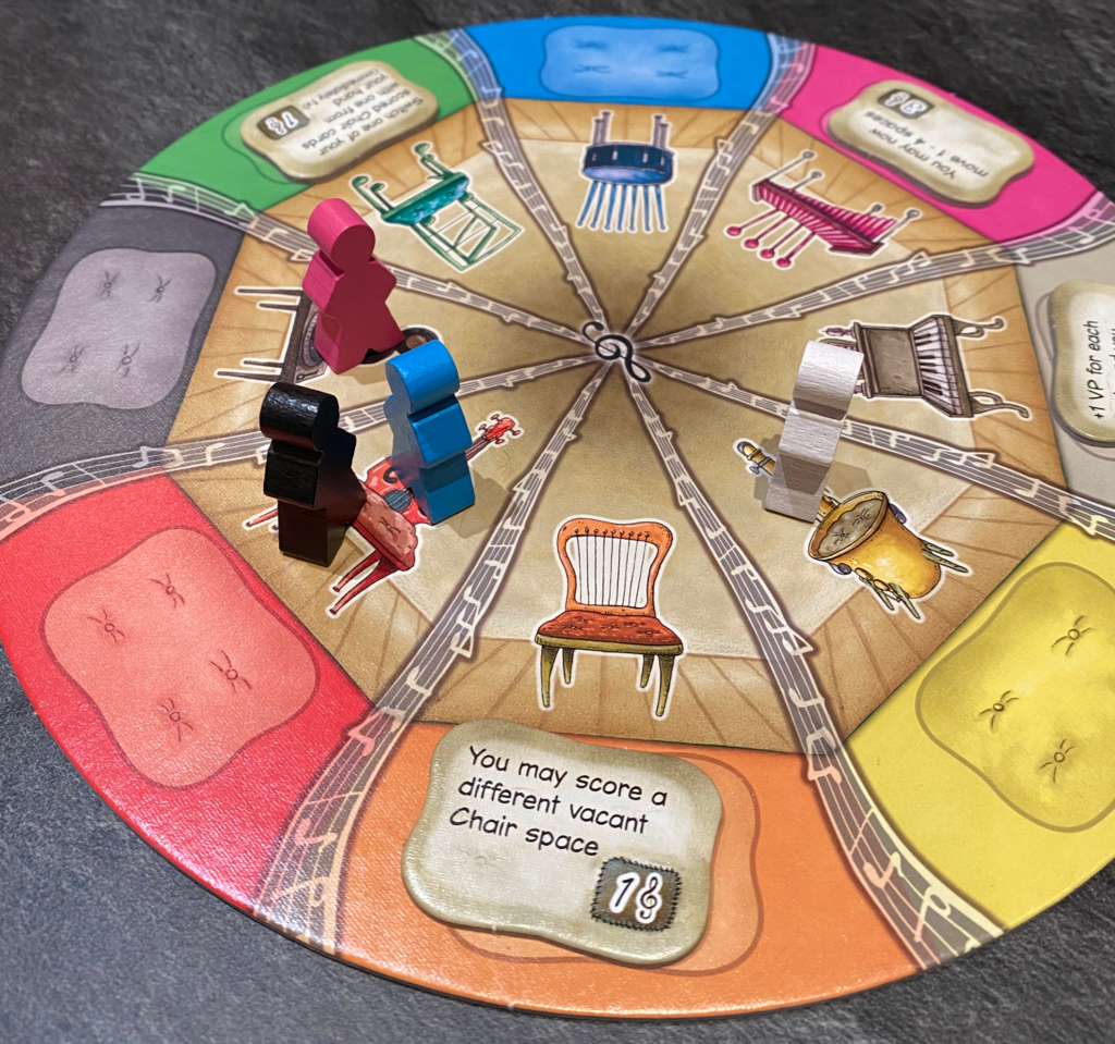 Le petit plateau central représente les chaises, chaque chaise a une couleur qui correspond aux suites (couleurs) des cartes. Chaque emplacement se voit attribuer en début de partie une tuile Coussin qui donne des points de victoires, un bonus pour le reste de la partie ou des mini objectifs pour glaner des PVs supplémentaires en fin de partie. Ces avantages s’activent lorsqu’un joueur acquiert un coussin.