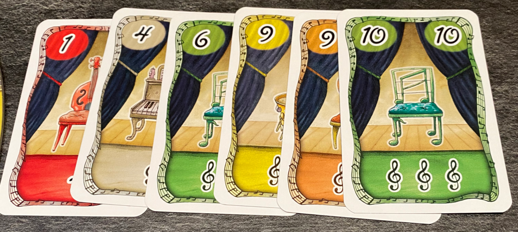 La musique s’arrête si le joueur ne veut pas (ou ne sait pas) jouer une carte de même valeur (1), Repos (2) ou Repeat (3) et qu’il n’a pas de carte dans sa main supérieure à la dernière jouée (4). C’est donc la fin de la manche.