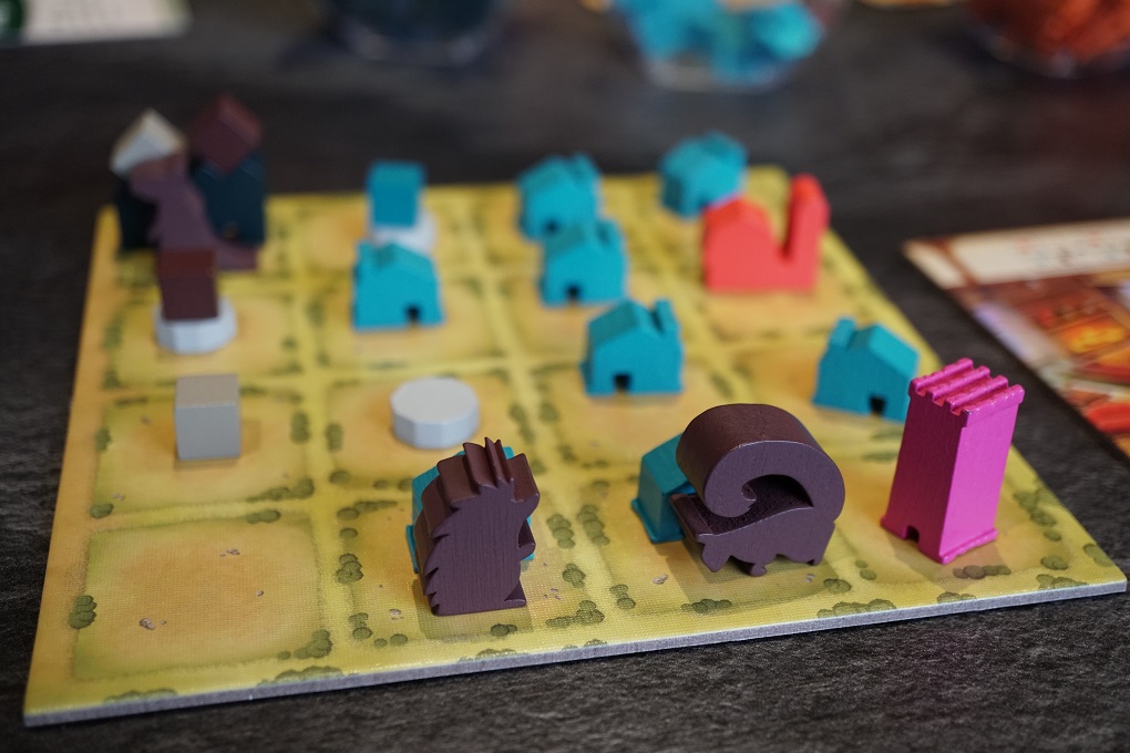 Les villageois ont peur des cubes ressources 😉 A la fin du tour d’une joueuse, si elle a placé un cube ressource sur la même case qu’un villageois et que ce cube s’y trouve toujours (il n’a pas été transformé en bâtiment), elle devra déplacer ce villageois sur une case vide adjacente.