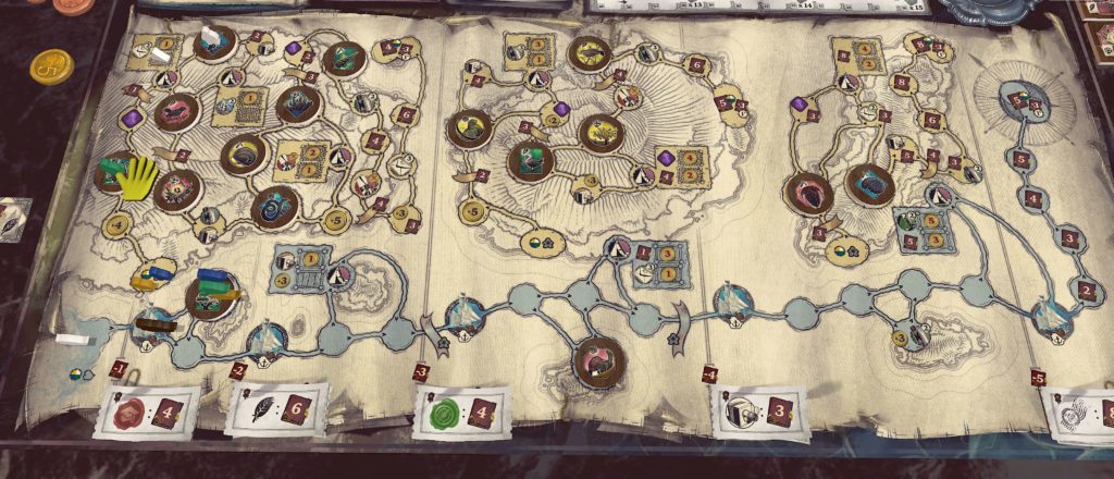 Enfin, la dernière grande action que vous pourrez réaliser dans Darwin’s Journey est le voyage et l’exploration des différentes régions du jeu. Et c’est principalement là où Darwin’s Journey fait penser à Newton et ses différentes pistes de voyage ou d’apprentissage. Différents bonus y sont disposés aléatoirement en début de partie et vous allez vous y déplacer pour les ramasser et les optimiser.