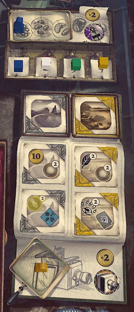 Alors c’est bien, bien évidemment, car ça va non seulement apporter beaucoup d’interaction au jeu mais également pas mal de tension. J’ai néanmoins trouvé que l’apport en PVs apporté par les fossiles était exagéré. Alors oui, évidemment, la découverte des fossiles est l’essence même du jeu, son but et son thème, un peu comme la construction de la pyramide dans Teotihuacan. Mais ici le jeu va jusqu’au bout car sans vous investir suffisamment dans la découverte des fossiles, vous ne pourrez prétendre à la victoire. Pourtant, les possibilités de gagner des PVs ailleurs sont nombreuses. Et c’est là où le jeu est trompeur. Il vous encourage à gagner 10 PVs par çi ou par là mais c’est rien face à la petite centaine de PVs que peut vous apporter la découverte des fossiles. Ce déséquilibre limite fort les stratégies puisqu’il n’y en a qu’une! Mais l’essentiel, un peu comme Teotihuacan, n’est pas le nombre de stratégies mais bien les multiples moyens de la suivre qui apportent la richesse et la profondeur de Darwin’s Journey.