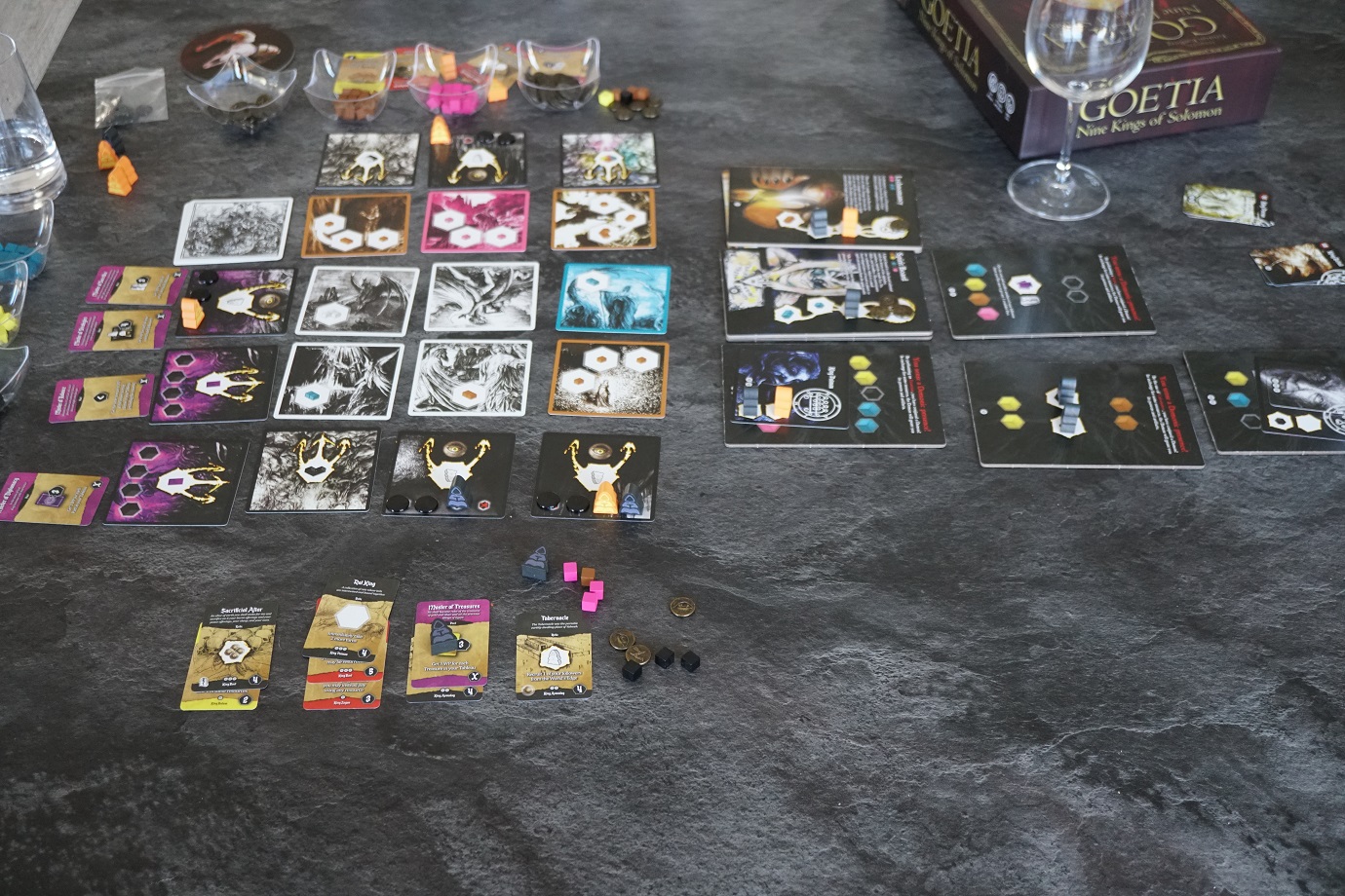La première chose qui frappe lors de la longue mise-en-place du jeu est sa modularité. Tout est modulaire dans Goetia: le plateau central qui ne sera jamais constitué des mêmes cartes, les 9 démons parmi les 12 qu’on va pouvoir réveiller, les cartes pouvoir que ces démons vont offrir et les cartes pactes (objectifs) de la partie. La variabilité de vos parties est assurée 🙂