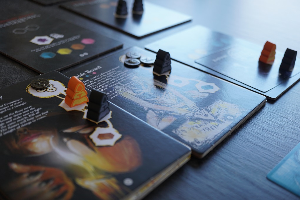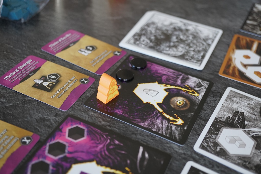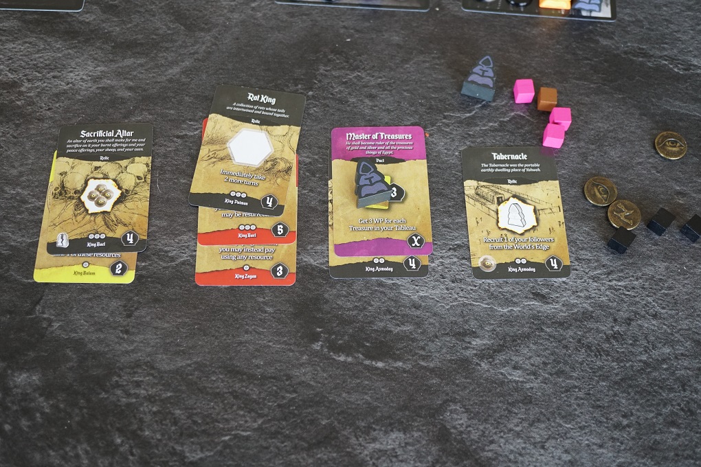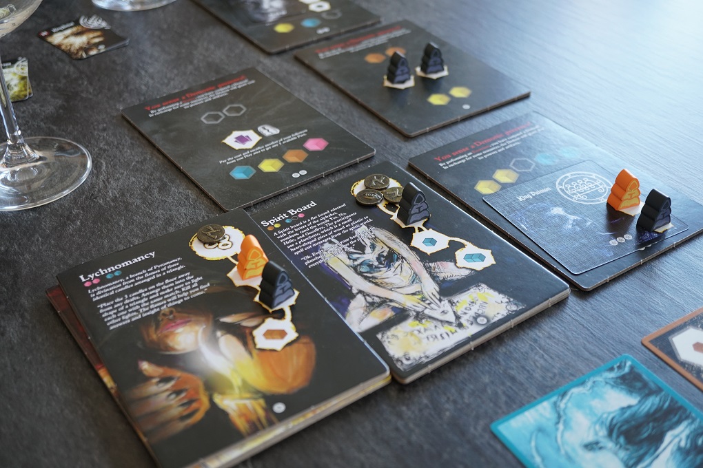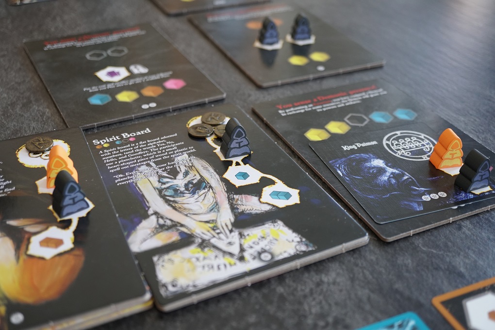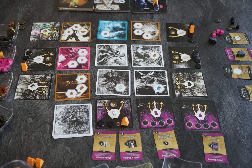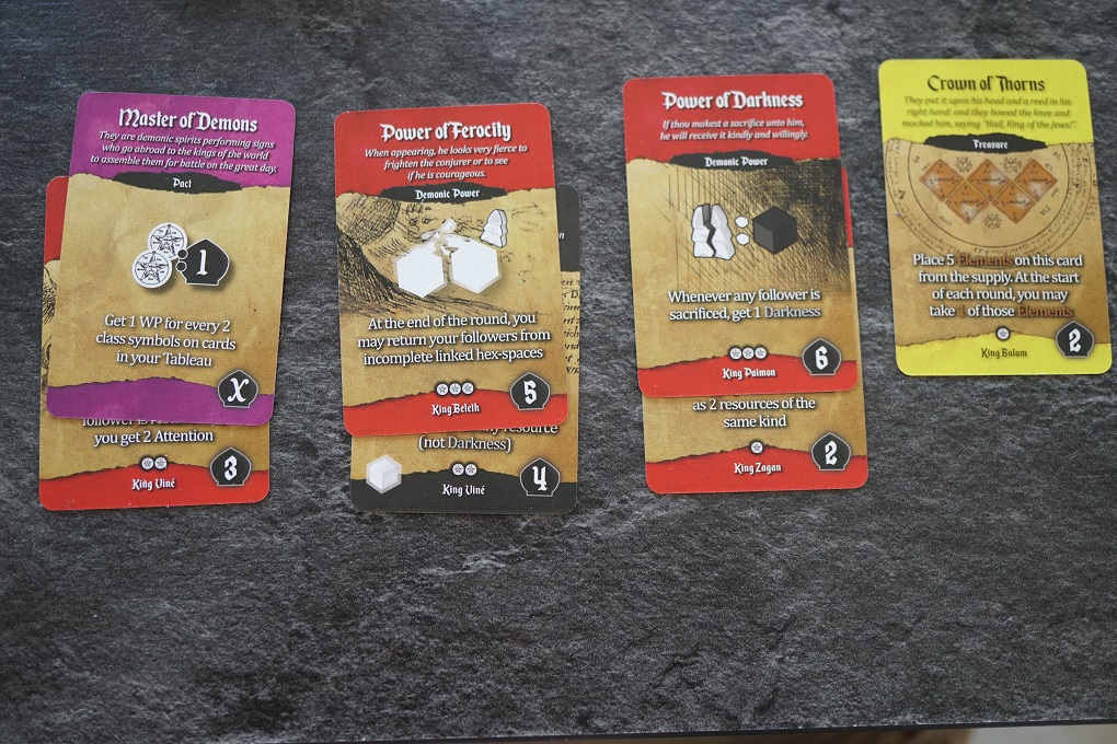 On retrouve cette astuce également avec les neufs cartes centrales (d’une certaine manière) et les grandes tuiles Démon. Quand une tuile Démon a perdu toutes ses « attentions », les joueurs pourront dès lors conjurer des démons (cartes qui offrent des capacité ou bonus pendant la parties). Il faudra un peu plus de resources du coup! Et quand toutes les cartes Démon sont prises, la tuile offre alors une action en plus, qui coûte encore plus de resources mais qui est bien puissante.
