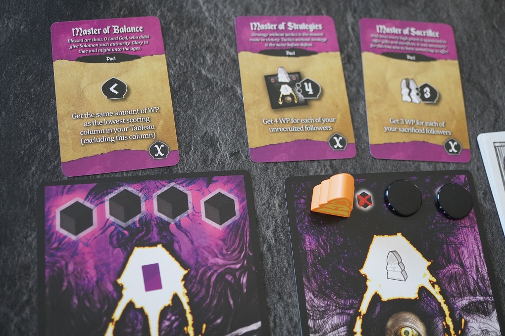 « Dans un premier temps », voilà l’astuce du jeu qui le rend bien intéressant. Les cartes entourant les 9 centrales et qui permettent d’acquérir de nouveaux Adorateurs vont évoluer. Dès que tous les adorateurs sont pris, la carte est retournée et offre une nouvelle action: récolte de resources (mais plus ou plus rares) ou prise de cartes Pacte, source importante de PVs.