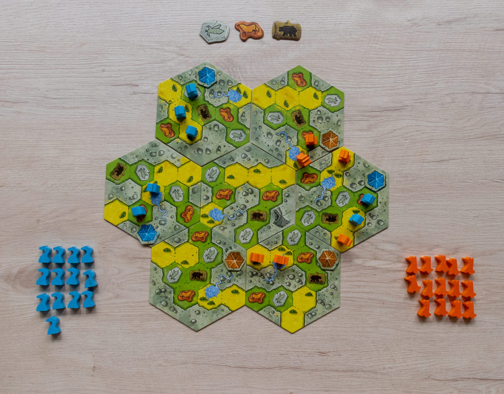 Nous avons apprécié la simplicité du jeu et sa grande rejouabilité. Le plateau de jeu est composé de sept tuiles hexagonales recto-verso rendant chaque partie différente. Les zones à conquérir sont positionnées de manière aléatoire ce qui permet de mettre en place une nouvelle stratégie à chaque fois. Il n’y a pas à dire, les plateaux amovibles sont vraiment appréciables pour augmenter la rejouabilité d’un jeu.