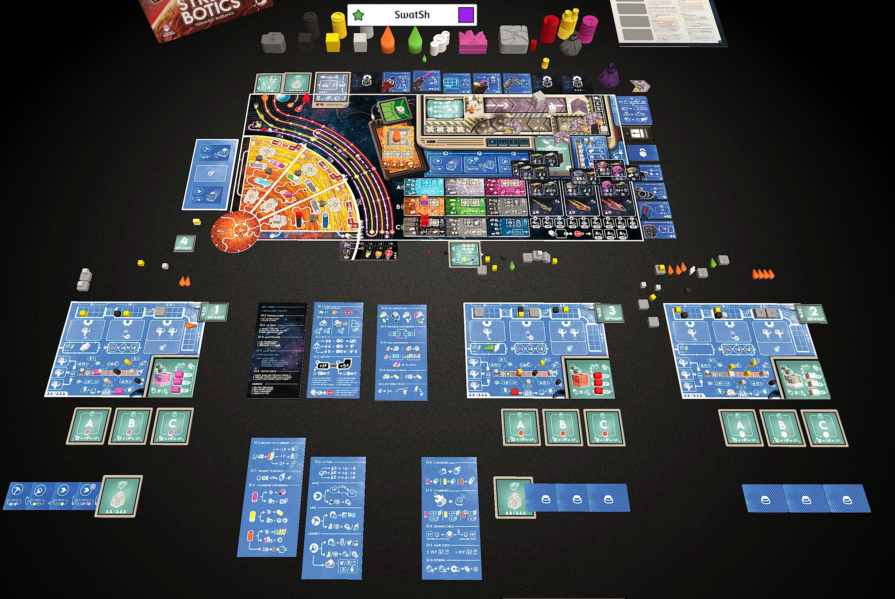 C’est lorsque l’éditeur 2 Tomatoes nous a fait découvrir Peak Oil Profiteer (en cours de financement ici) qu’il nous a parlé de sa seconde sortie du moment: Stress Botics. Lorsqu’il nous a dit qu’il s’agissait d’un jeu très complexe, notre intérêt pour le jeu a été titillé 😉 Contrairement à Peak Oil Profiteer, 2 Tomatoes a décidé de ne pas porter Stress Botics sur une plateforme de financement mais de le proposer en précommande sur son site ici jusqu’au 5 Août 2021. Nous avons eu la chance d’y jouer sur Tabletop Simulator (lien vers le jeu TTS ici) et en voici notre compte rendu et nos premières impressions.