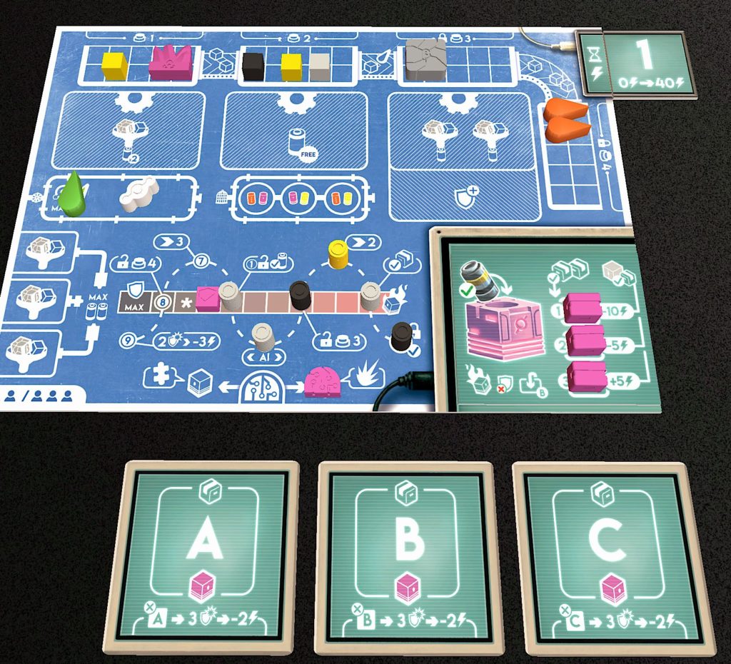 Vous allez également pouvoir construire des batteries qui se placeront sur une échelle et qui, à chaque étape, vous apporteront une capacité permanente (stockage plus efficace, déplacements plus faciles, échanges de ressources,…). Mais ces batteries pourront également être dépensées pour augmenter la puissance de vos actions. Evidemment, une batterie dépensée équivaut à une capacité permanente de perdue. Cela va provoquer des choix intéressants et pas évidents. Et ce n’est pas tout, une autre échelle s’entremêle avec celle des batteries et si vous vous faites attaquer, vous risquez de perdre des batteries et donc des capacités permanentes.