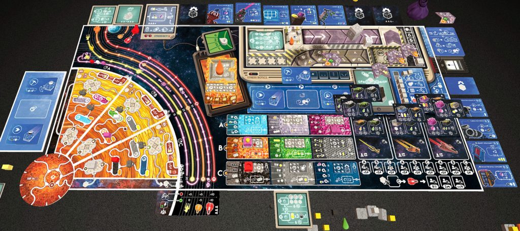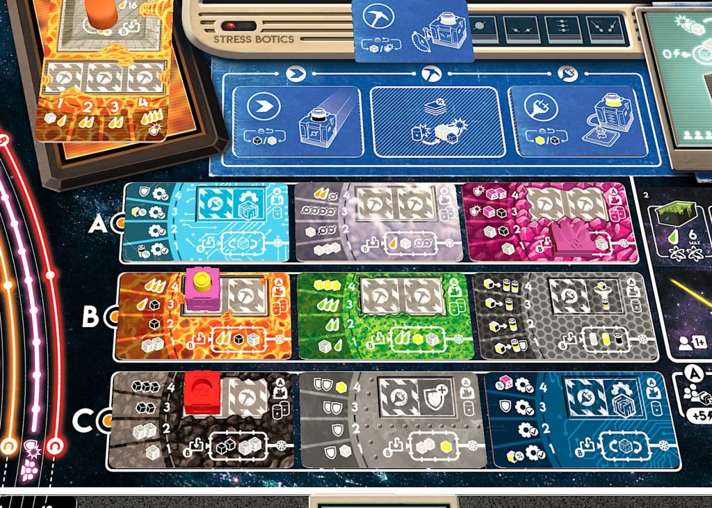 Stress Botics est un jeu costaud qui nous a impressionnés et enthousiasmés. Vous contrôlez un robot qui va se déplacer sur une planète hostile afin d’y extraire des ressources pour les charger sur les navettes qui orbitent tout autour. Les navettes ont certaines demandes spécifiques à chaque partie qu’il va vous falloir satisfaire (elles agissent comme des objectifs de partie). Pour cela vous allez acquérir des cartes action qui vous permettront de réaliser les différentes actions du jeu de manière plus ou moins efficace. Vous aurez également l’occasion d’acquérir des grands et petits objets qui vous apporteront des grandes ou petites capacités permanentes 😉 qui vous permettront d’accentuer votre stratégie pour arriver à vos fins. De plus, de nombreux éléments vont évoluer en cours de partie vous permettant de vous construire un moteur et même de l’endommager pour gagner des bonus tactiques intéressants. A cela va s’ajouter une gestion de cartes action que vous devrez acquérir à chaque tour ou garder de tour en tour afin d’élargir vos choix mais au prix de ressources précieuses.