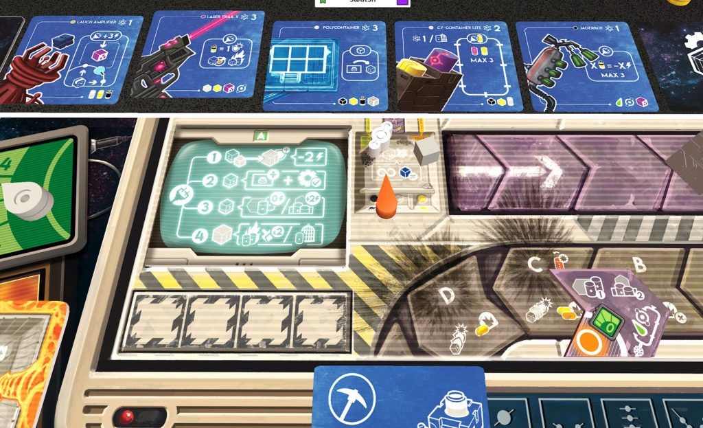 Le jeu va vous obliger en effet à gérer une multitude d’éléments. Outre vos cartes actions (j’y reviens plus loin), vous allez devoir gérer les multiples ressources de Stress Botics: la lave, le titanium, l’acide, la Beta Mater, le gaz et le charbon. Mais attention car vos emplacements de stockage sont limités en place et certaines ressources comme la lave vont détruire les autres ressources du même conteneur. Ca peut vous nuire comme vous avantager car les matières brulées par la lave se transforment en … lave 🙂 ! De plus, en fin de tour, la lave se refroidit dans vos containers et se solidifie en devenant de la roche intéressante pour certaines actions. Et ce n’est pas tout car vous serez amenés à réaliser des expériences chimiques en mélangeant du gaz ou de l’acide à d’autres ressources vous apportant des effets bénéfiques dont vous pourrez profiter tout au long de la partie.