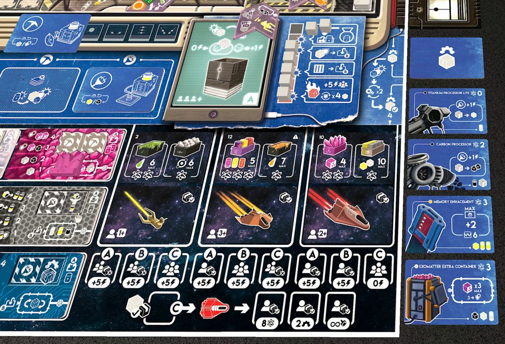 De plus, vous allez bien devoir gérer vos stocks. Vous disposez de différents containers pour placer vos ressources. L’endroit où elles se situent est important pour certaines actions. Vous allez pouvoir les déplacer entre vos containers mais uniquement vers la droite! Voilà une autre contrainte qu’il vous faudra bien maitriser. Vous aurez même l’occasion de gagner de nouveaux containers…