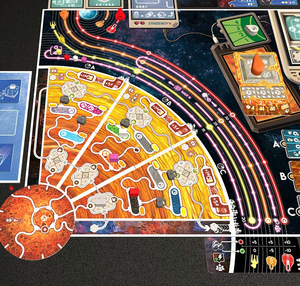 Et ce n’est pas tout, certaines actions que vous allez réaliser vont augmenter votre stress. Mêmes les actions de vos adversaires pourront influencer votre stress. Et évidemment, avoir trop de stress aura des effets négatifs et vous empêcheront de réaliser certaines livraisons de ressources. Diminuer votre stress et bien le gérer sera primordial dans Stress Botics. Mais tout n’est pas si simple et le plus stressé aura l’avantage d’être le premier joueur. Voilà un avantage qui vaudra quelques fois la chandelle 😉