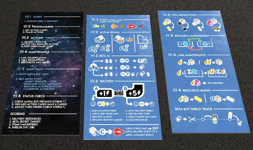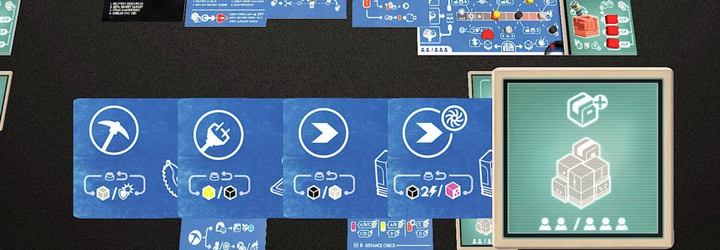 A chaque tour, en fonction de l’endroit où votre robot se situera par rapport à l’alphabot, vous recevrez entre 1 et 3 cartes actions que vous piocherez face visible sur les 3 paquets de cartes action (un paquet pour chacun des 3 types d’action: déplacement, réalisation de l’action de la salle ou extraction de ressources). Mais chaque carte action est différente et propose une petite variante bien que globalement, les cartes actions de déplacement vous serviront à déplacer votre robot, les cartes extraction à extraire des ressources et les cartes connexion à réaliser les actions spéciales.