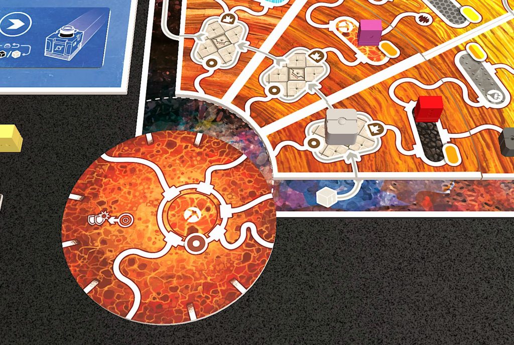 Mais ce n’est pas tout, le tout est dirigé et rythmé par l’Alphabot. L’Alphabot est notre maître à tous et les joueurs auront intérêt à réaliser leurs actions dans un rayon proche d’où il se trouve. L’Alphabot va se déplacer à chaque 2 tours selon un trajet prédéfinit et, donc, prévisible. Si votre robot se trouve à l’endroit de l’alphabot, il pourra réaliser des actions spécifiques à ce dernier. De plus, plus vous serez situé proche de l’Alphabot, plus de cartes action vous allez pouvoir piocher. Vous aurez donc souvent intérêt à tourner autour de lui mais certains éloignements plus aventureux seront souvent bénéfiques à condition de bien les planifier pour pouvoir faire face aux désavantages de l’éloignement.