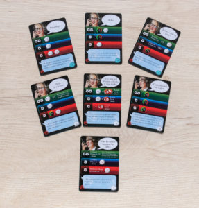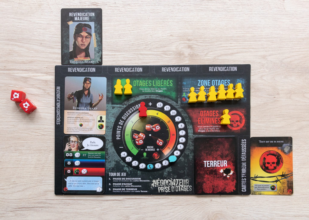 Pour débuter, on choisit un preneur d’otages. Avec nos 6 cartes de discussions de départ, nous allons devoir les libérer. À chaque carte jouée, il faut lancer les dés. En fonction de leurs résultats, on applique les indications inscrites sur la carte. Cela peut énerver le preneur d’otages ce qui n’est pas très bon signe, le calmer, lui permettre de parler … Quand toutes les cartes sont jouées, une deuxième phase débute. On achète de nouvelles cartes discussions avec les points obtenus lors de la phase précédente. Plus on a de points, plus on peut acquérir des cartes puissantes. Il est impossible de débloquer la situation avec les cartes de départ, il faut absolument en obtenir de plus fortes. Puis vient la phase de terreur ! On doit révéler une des 10 cartes Terreur et l’appliquer. Parfois elles permettent de libérer un otage mais le plus souvent elles ont des effets négatifs. Si l’on n’a pas réussi à trouver une issue favorable avant la fin de ce deck, la partie est perdue.