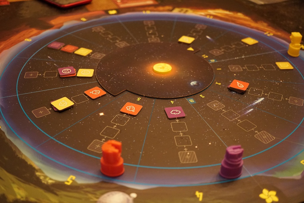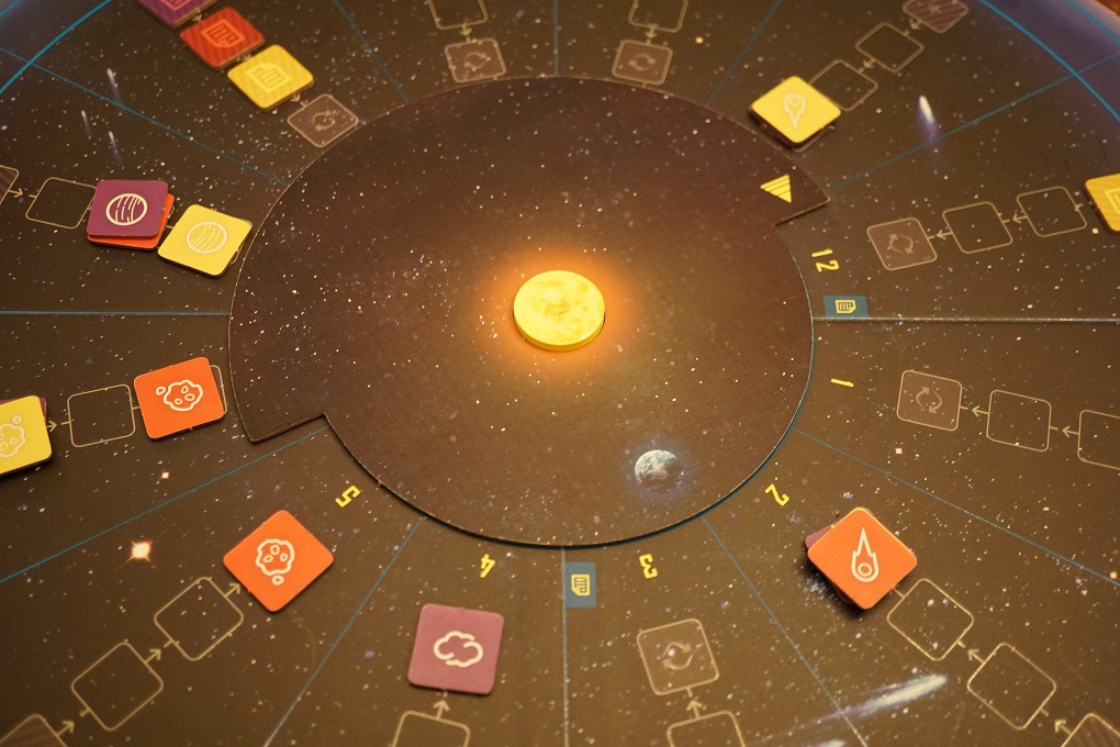 Chaque action coute un certain temps et les joueurs vont avancer leur marqueur du nombre de cases correspondantes. Un peu comme dans Tinner’s Trail (et beaucoup d’autres depuis lors), ils devront alors attendre que leur marqueur se retrouve derrière les autres pour réaliser une nouvelle action. A noter aussi que le jeu va ajouter quelques petites mécaniques assez sympas qui vont délimiter les secteurs où vous aller pouvoir réaliser vos actions en fonction de l’emplacement des jetons joueurs. Le jeu va également générer des petits événements qui vont donner de nouvelles indications aux joueurs et qui vont leur permettre de parier (avec plus ou moins de certitude) sur l’emplacement de l’un ou l’autre corps céleste. Et cette partie est particulièrement savoureuse car non seulement elle va permettre de gagner des points bonus mais elle va aussi apporter des infos supplémentaires sur certains secteurs. Il va même s’en suivre un jeu de spéculation où on va tenter de deviner ce que les autres ont misé sur chaque secteur et progresser dans nos déductions en fonction des mises des autres joueurs.