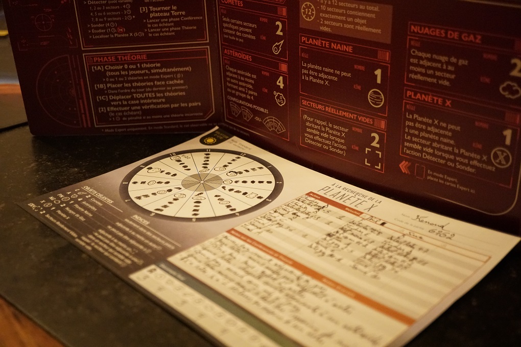 Cependant, Planète X diffère quand même d’une certaine manière. On doit bien sûr trouver des indices mais également de nouvelles théories. Alors, pour moi qui joue rarement à ce style de jeu, nouveau ou pas, j’ai trouvé cela « différent ». Une théorie donne des indications (ou indices) d’objet par rapport à d’autres objets. Par exemple, la planète naine n’est pas adjacent à un astéroïde. Ces théories sont donc importantes dans notre recherche.