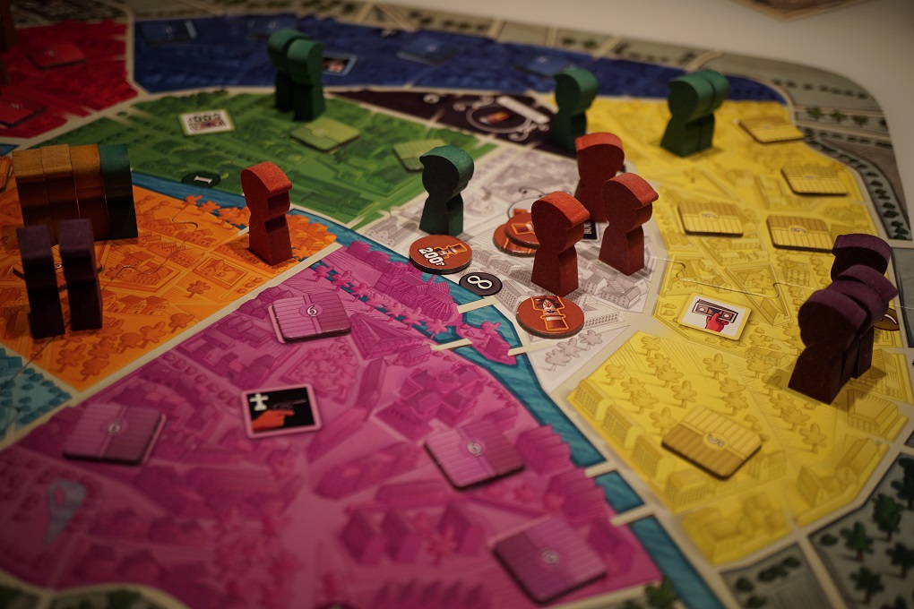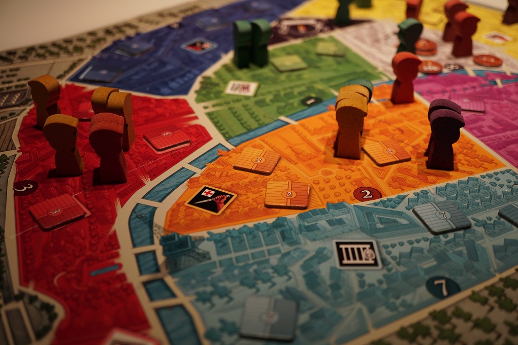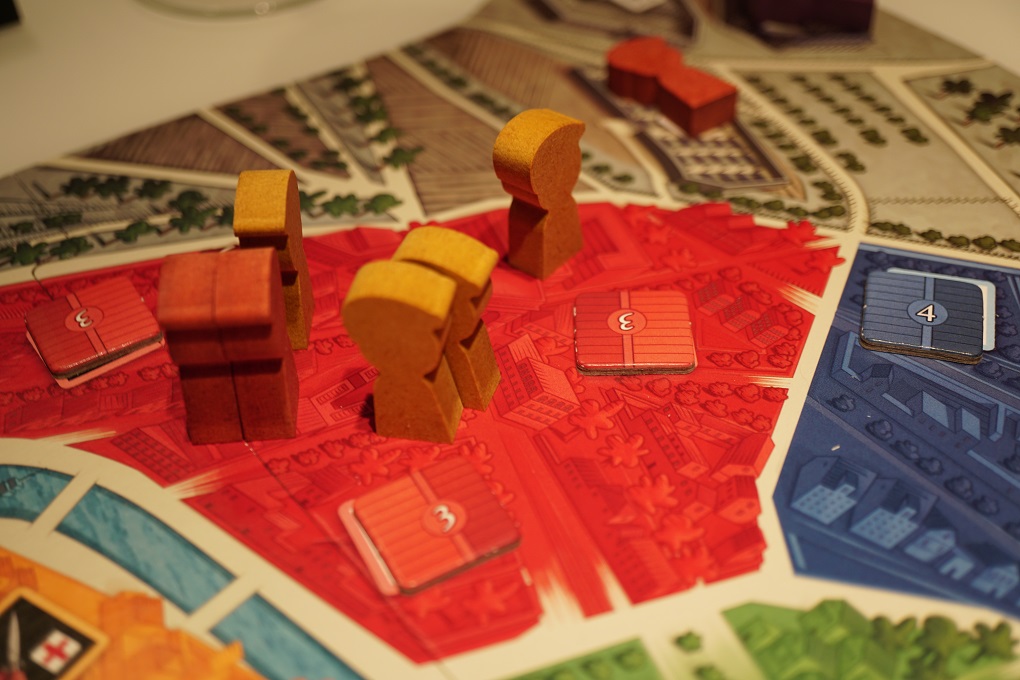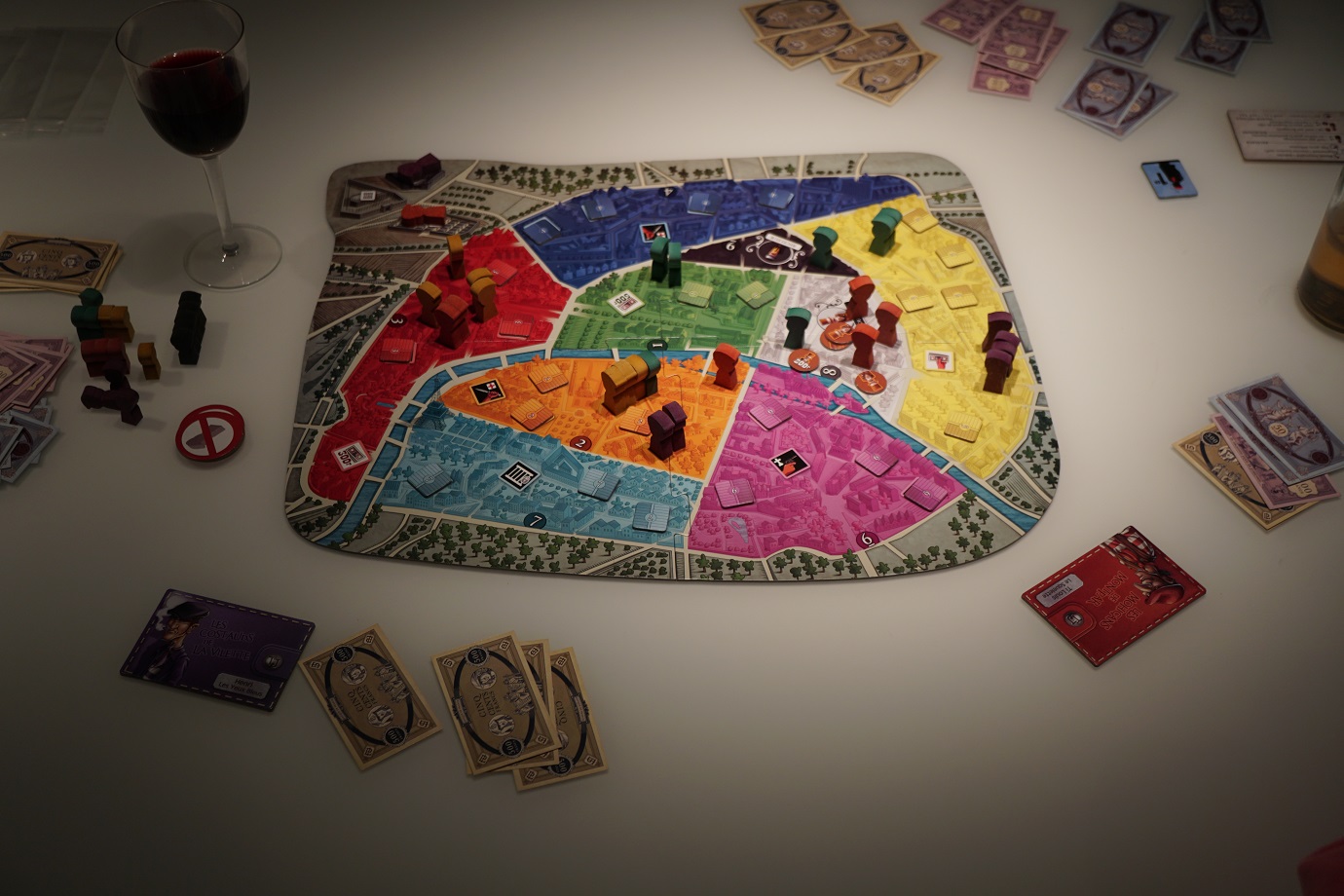 Les règles sont simples, et c’est indispensable pour ce genre de jeu qui doit être relativement « évident ». Mais cette simplicité n’empêche pas la présence de plusieurs éléments ou mécanismes qui rendent l’affaire beaucoup plus intéressante qu’elle ne parait au premier abord. D’abord et avant tout, évidemment, le mécanisme de base du jeu. La divulgation progressive des planques est vraiment un processus que j’adore. Le but étant évidemment de terminer en contrôlant un ou des quartiers lucratifs. Donc de garder jusque très tard dans la partie pour soi les planques qui donnent des informations intéressantes. Et ce plaisir commence dès le début de la partie, avec le choix à tour de rôle des planques sur le plateau (quels quartiers privilégier, plutôt proches les uns des autres ou pas, est-ce que je laisse mes adversaires prendre plusieurs planques dans le même quartier, et du coup avoir plein d’infos sur ce quartier, est-ce qu’au contraire je les marque à la culotte…), et ne fait que croître tout au long de la partie, puisque les choix deviennent à la fois de mieux en mieux éclairés, puisque vous avez de plus en plus d’informations, mais aussi de plus en plus cornéliens puisque chaque planque que vous révélez aidera les autres joueuses pour leurs choix à elles… une sorte de mini supplice chinois, avec une belle mise en évidence de la maxime « choisir c’est renoncer ». Savoureux!