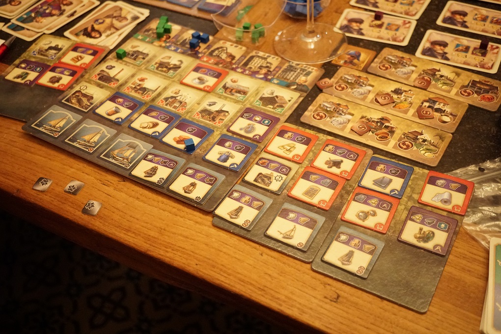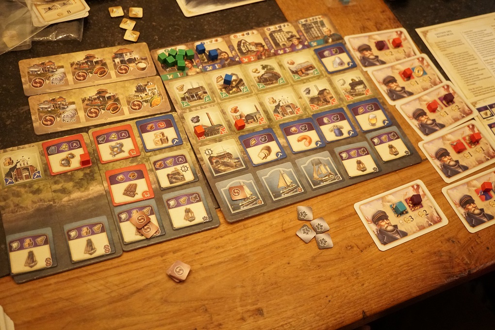 Le coeur du jeu est ultra classique: vous allez produire des ressources, qui vous permettront de construire des bâtiments, des bateaux… qui vous permettront de produire plus de ressources et d’explorer le nouveau monde (ce qui vous permettra de découvrir de nouvelles ressources qui vous permettront de construire de nouveaux bâtiments permettant de produire de nouvelles ressources qui elles-mêmes…). Ensuite vous pourrez construire de nouveaux bâtiments qui vous permettront… ok ok j’arrête. Mais sérieusement c’est vraiment ça. Et tout au long de la partie vous pourrez réaliser des contrats qui vous donneront des points de victoire mais vous permettront d’avoir de nouveaux ouvriers, d’améliorer vos ouvriers existants, de gagner des points… Bref on est dans de la construction de moteur à 12000% (en sous-estimant un peu).