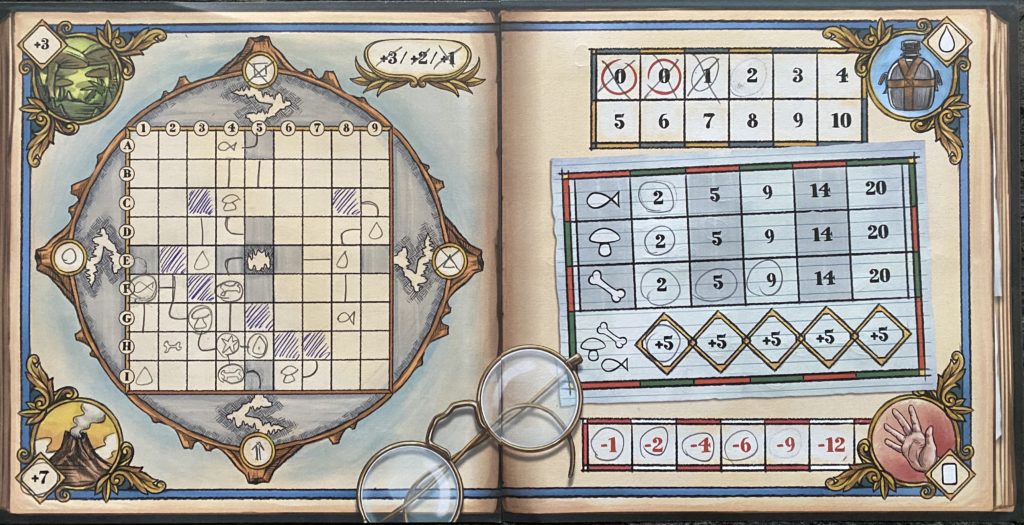 Enfin, une telle expédition n’est pas sans danger. Certaines cartes sont donc des cartes Danger. Et quand ces dernières sont piochées, c’es votre adversaire (de gauche ou de droite) qui noircira des cases sur votre grille. (comme les Embuscades dans Cartographers).