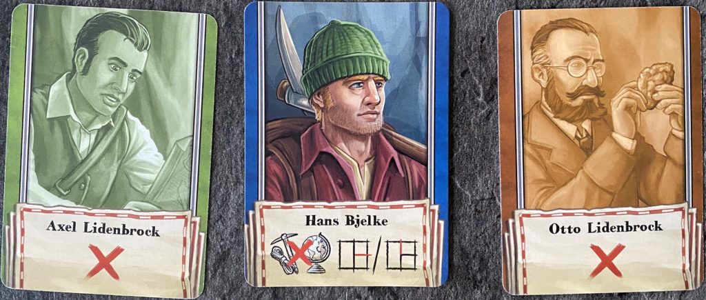 Cette mécanique ne laisse pas beaucoup de place aux choix. En effet, le joueur doit remplir une case de la ligne ou colonne indiquée par la carte Exploration, et pas ailleurs où cela pourrait être nettement plus intéressant. Pour palier à cette « rigidité », Voyage au Centre de la Terre ajoute trois personnages que chacun peut utiliser quand il le souhaite. Du moins tant qu’ils sont disponibles. Ces personnages permettent d’ajouter une intersection à un de vos tunnels, d’ajouter une découverte « joker » (sous forme d’une étoile) ou encore d’utiliser une ligne ou colonne adjacente à celle indiquée. Et comme dans pas mal de jeux avec Personnages, chaque utilisiation coûtera des PVs négatifs en fin de partie. De plus, certaines cartes Tunnel rendent ces personnages indisponibles.