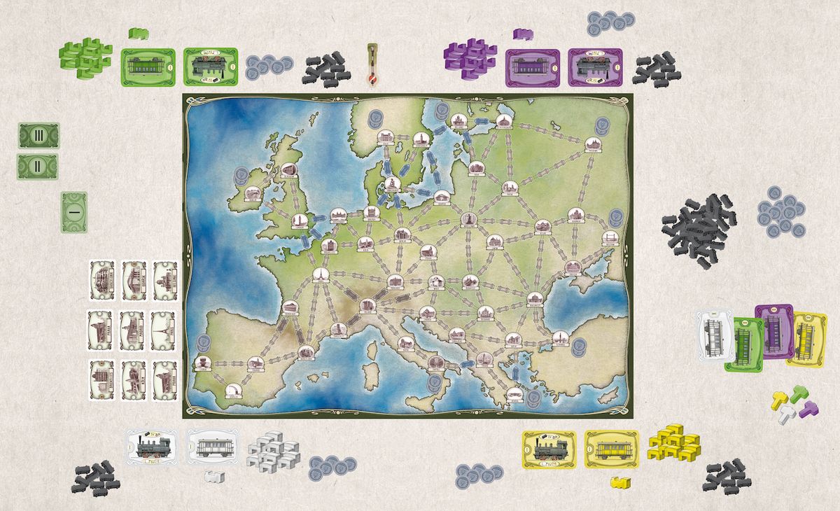 Chaque joueur débute avec un itinéraire, c’est à dire une ville de départ et une autre ville d’arrivée. En début de partie, les trains des joueurs sont placés sur leur ville de départ. Le choix de ces villes suit une mécanique bien précise. Mise à part au début, 6 ensembles de 3 cartes Ville sont disponibles. Le joueur choisit 2 cartes sur un seul ensemble. De plus, les 3 cartes formant un ensemble sont placées l’une en dessous de l’autre et le joueur en choisit 2 adjacentes: la première est donc la ville de départ et la seconde la ville d’arrivée. La troisième carte est quant à elle défaussée. Enfin, on remplace cette ensemble par trois nouvelles cartes Ville, donnant un même choix de 6 ensembles au joueur suivant.