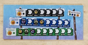 On score en fonction de la difficulté de la piste mais également du style imposé pour la descendre. Si vous arrivez à poser des cartes avec le symbole représentant le style de la piste, vous gagnez des jetons Renommée qui servent à améliorer votre équipement. Quand l’ensemble des participants a joué, tout le monde redescend au village. Le joueur le plus proche de celui-ci pourra alors se placer en premier sur les emplacements des boutiques de la station. Ces derniers permettent de récupérer des cartes, de la renommée, du matériel et même des tickets de remontée mécanique.
