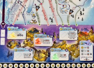 – À chaque fois qu’une piste est empruntée, il faut une carte supplémentaire pour qu’un joueur puisse la descendre de nouveau. Cela induit une course pour être le premier à faire les meilleures pistes. Si la piste a été descendue deux fois, il faut deux cartes en plus pour la refaire ! Mieux vaut ne pas traîner !