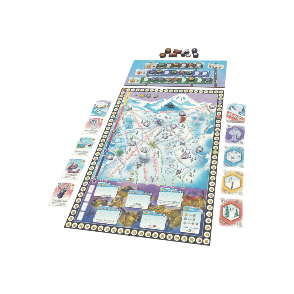 À chaque tour, le skieur réalise deux actions sur les trois disponibles : prendre deux cartes dans une rivière, prendre le téléski car pour descendre il faut d’abord monter ou s’élancer sur des pistes. Les points sont marqués au fur et à mesure ce qui permet de suivre la compétition et de ne pas se laisser distancer par les adversaires.