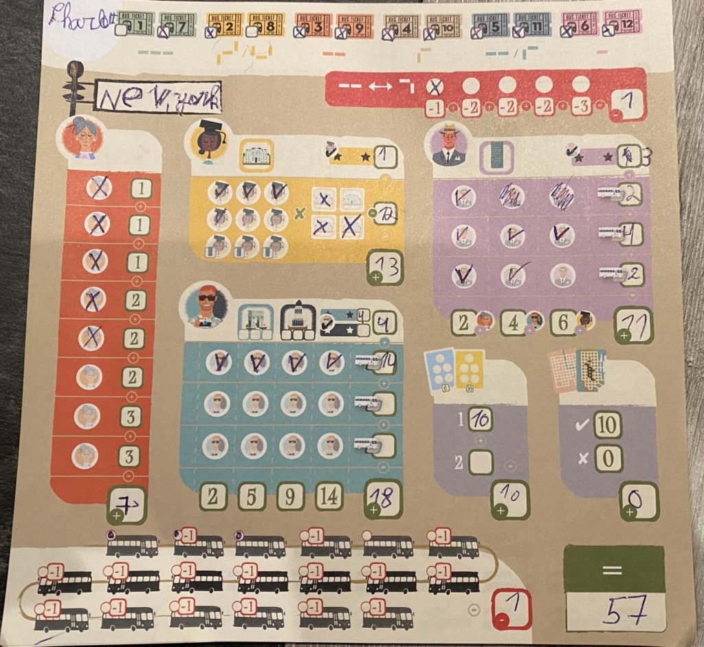 Le thème, on peut plus le deviner avec le nom du jeu de 2018 que ce nom-ci. Il s’agît de créer une ligne de bus de Londres ou de New York. La construction de cette ligne se fera sur le plateau central. Il y a peu restrictions, mis à part d’éviter de faire une boucle avec sa propre ligne. Cette construction dépend du ticket de bus retourné qui indique combien de tronçons ajouter et combien de virages il faut faire avec cet ajout. Le ticket indique un nombre qui est repris en haut de chaque feuille individuelle et qui indique ces informations (# tronçons et # de virages). Et cette référence n’est pas la même sur tous les feuillets. Voilà une bonne manière d’offrir une légère asymétrie dans ce type de jeux.