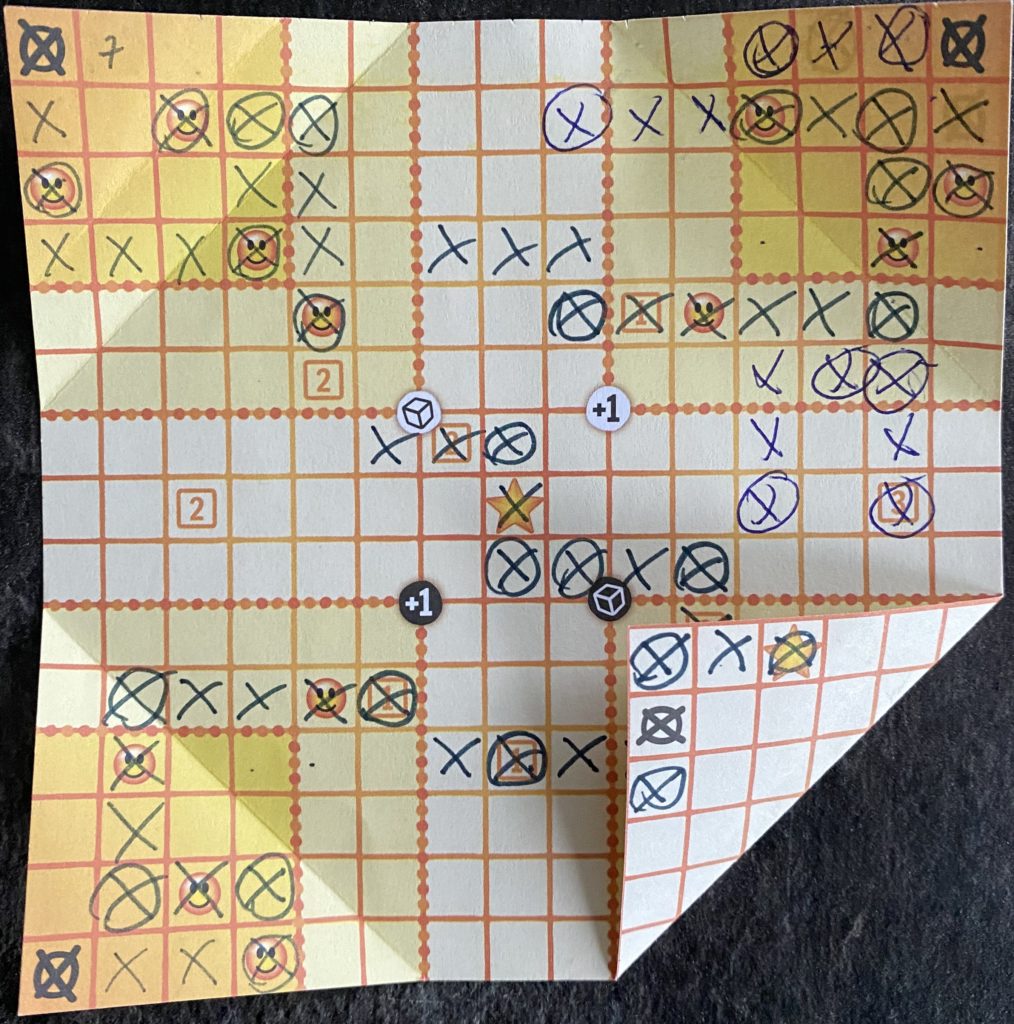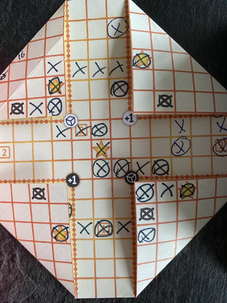 Pour plier un coin de la feuille, vous devez cocher tous les smileys dans un carré délimité. Chaque coin a deux carrés délimités, un petit avec trois smileys et un plus grand avec un smileys supplémentaire. C’est le joueur qui choisit, après avoir cocher les 3 smileys du plus petit carré, s’il décide de plier tout de suite le coin de la feuille ou s’il désire attendre de cocher le quatrième smiley pour plier un coin plus « grand ». Plier un coin de feuille fait bien évidemment apparaître une cible à atteindre supplémentaire mais cachant éventuellement des cases bonus.