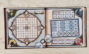 Quoi ? Je ne vous ai parlé d’Otto, Hans et Axel ? Ces trois personnages font partis de l’expédition  (et même du livre). Ils sont présents pour vous donner un coup de main en cas de besoin. Il est possible d’utiliser leur pouvoir tant qu’ils sont actifs mais moyennant des points négatifs exponentiels à chaque utilisation. Ils passent sur leur face inactive dès qu’une carte Expédition vous l’indique. Ce qui signifie qu’avec de la poisse cela peut arriver dès les premiers tours ! Mais ce n’est pas le seul sale coup que le jeu réserve car les cartes Expédition peuvent révéler des monstres. Dans ce cas, il faut passer sa feuille Terre à son voisin qui va gribouiller une case qui sera désormais inaccessible. C’est agaçant lorsque l’on découvre la vacherie sur notre feuille mais assez jubilatoire quand on noircit frénétiquement une case adverse.