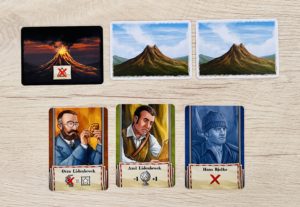 Les deux paquets de cartes n’en contiennent pas le même nombre ce qui implique de mélanger la défausse à des moments différents. Par conséquent les combinaisons Exploration / Orientation sont rarement les mêmes, offrant ainsi une plus grande rejouabilité. Lorsqu’il faut mélanger le paquet Expédition, plusieurs événements se produisent. Tout d’abord, il faut rayer une case Eau pour étancher sa soif. Si vous n’en avez pas découvert, vous mourrez de soif et l’aventure s’achève ici pour vous. Puis on révèle une des trois cartes Volcan indiquant celui qui entre en éruption. Vous aviez prévu de sortir par-là ? Dommage, il faut revoir vos plans… Et enfin, vous réactivez vos compagnons d’aventure.