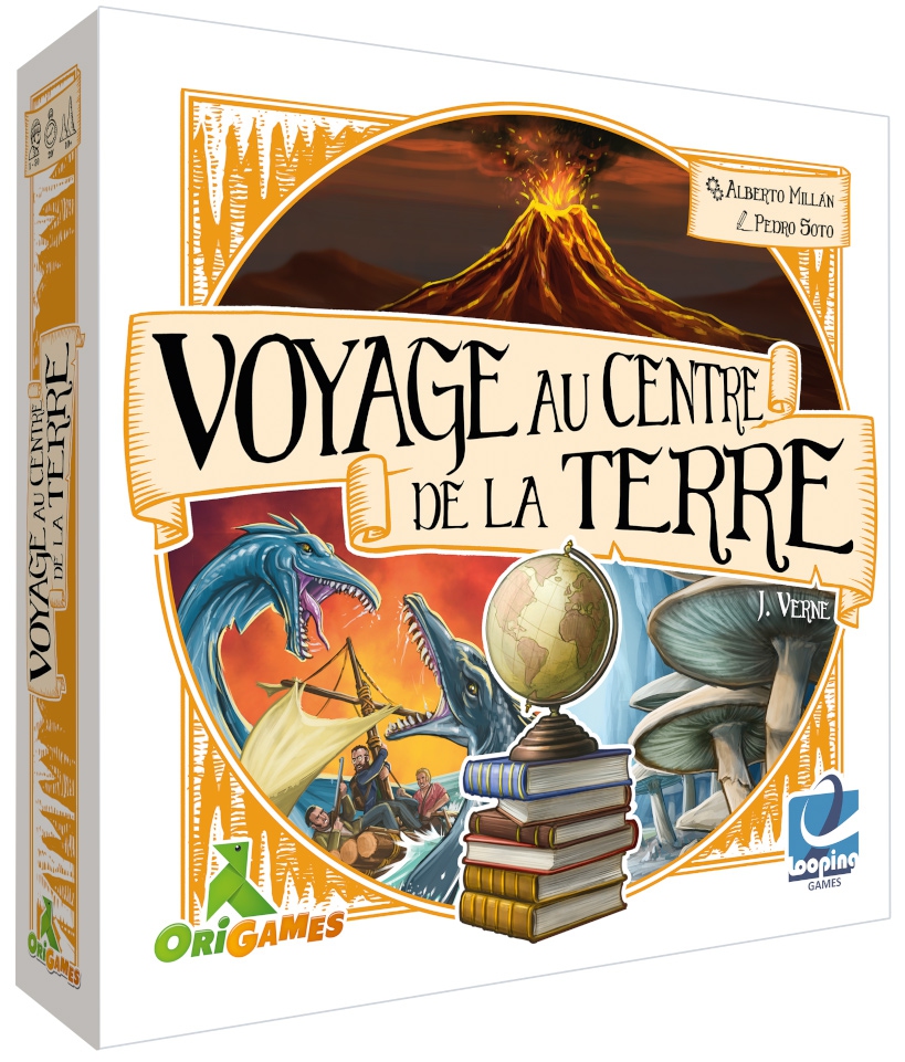 Comme vous vous en doutez, Voyage au centre de la Terre est basé sur le célèbre roman de Jules Verne. Munis de deux feuilles et d’un crayon bien taillé, les explorateurs choisissent un des quatre volcans pour entrer sous la croûte terrestre. L’objectif est de passer par le centre de la Terre et de réussir à sortir par l’un des trois autres volcans avant de mourir de soif et avant qu’ils n’entrent en éruption. La première feuille représente une coupe stylisée de la Terre tracée dans un carré 9*9 avec en son centre le noyau alors que la deuxième permet de tenir un scoring au fur et à mesure que le jeu avance.