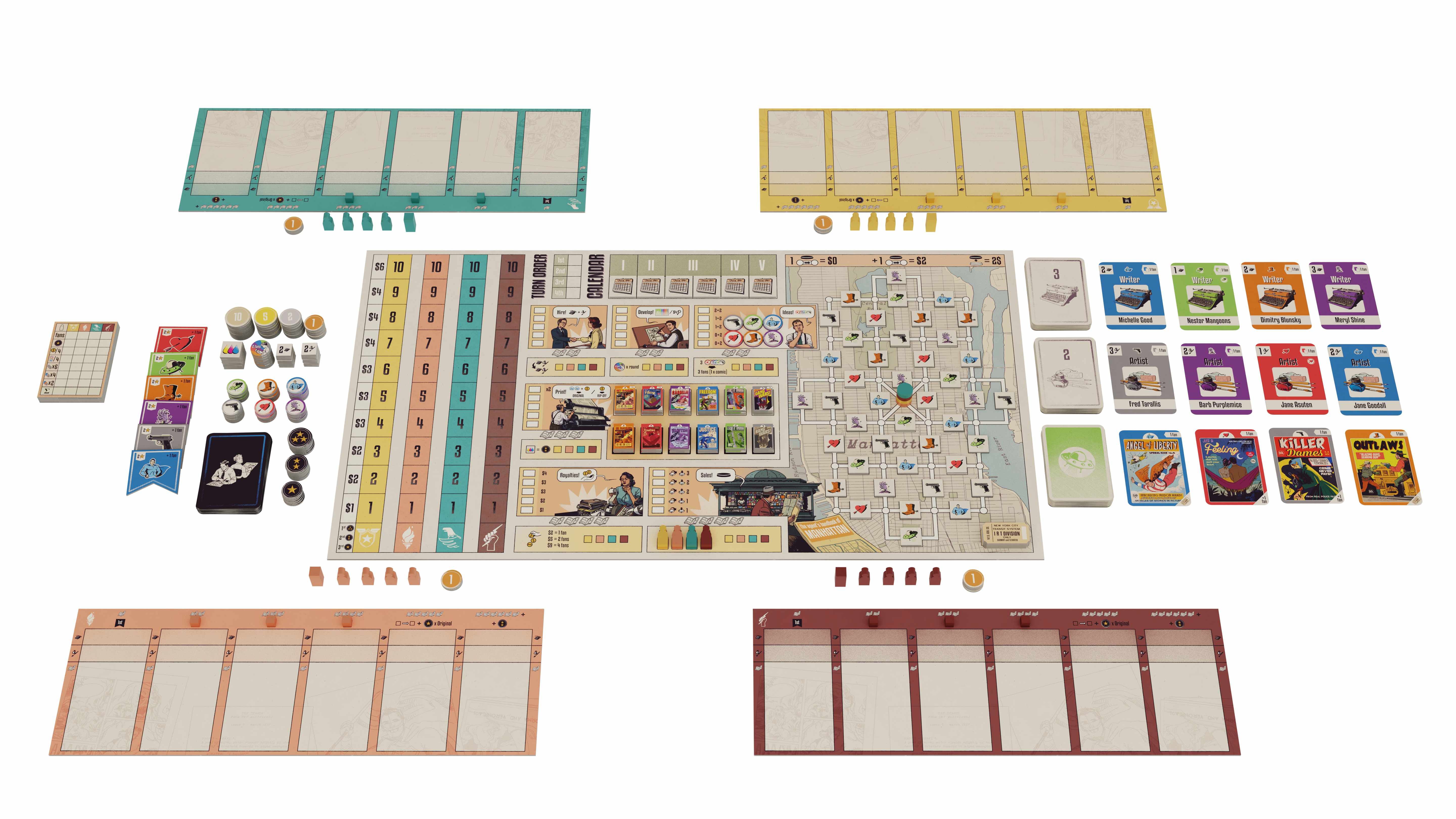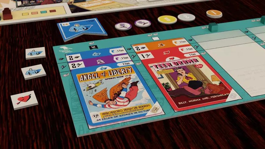 Quand ils produisent un nouveau comics, les joueurs vont devoir investir un maximum dans la qualité de ce comics car, plus on investit, plus renommée sera élevée (= l’axe vertical). Et plus cette valeur est élevée, plus l’argent et les PVs qu’elle rapportera à chaque tour seront élevés. Mais plus d’effort vous consacrerez à la qualité de votre comics, moins de temps vous aurez pour en produire d’autres…