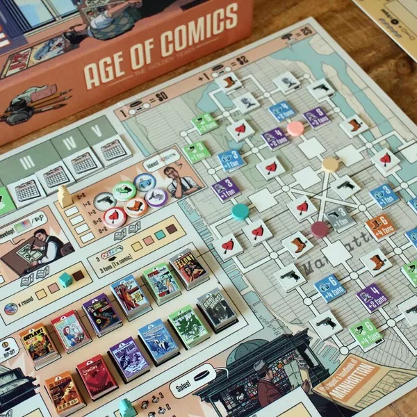 D’un côté très classique et linéaire, Age of Comics présente néanmoins pas mal d’atouts. Le plus fort est comment les auteurs ont réussi à imprégner le thème dans le jeu. On y est à produire et vendre nos comics, et à fond! Le matériel y est pour beaucoup c’est sûr mais les mécaniques aussi. J’ai adoré celle qui fait perdre de la renommée à chaque tour pour chaque comics produit: le public se lasse et veut de la nouveauté (je suis sûr que ça vous parle 😉 )! Le jeu plait aussi grâce à ses choix difficiles, les bonus générés par certaines actions qu’il va falloir optimiser, ses deux axes stratégiques et leurs possibles combinaisons. Allez-vous vous développer verticalement ou horizontalement? L’axe vertical vous rapporte argent et PVs alors que l’axe horizontal vous apporte plus de souplesse au jeu en permettant d’échanger des cartes, de gagner plus à chaque comics produit, de pouvoir échanger des idées, de gagner des PVs quand on fait certaines actions, de dépenser de l’argent pour gagner des fans ou même de gagner un nouvel ouvrier pour un tour. Pas facile tout ça surtout quand vous y ajouter des objectifs à atteindre et un jeu de majorité dans chaque thème de comics produits. A noter que le jeu est sans texte mais des règles Françaises seront disponibles, au moins en pdf.