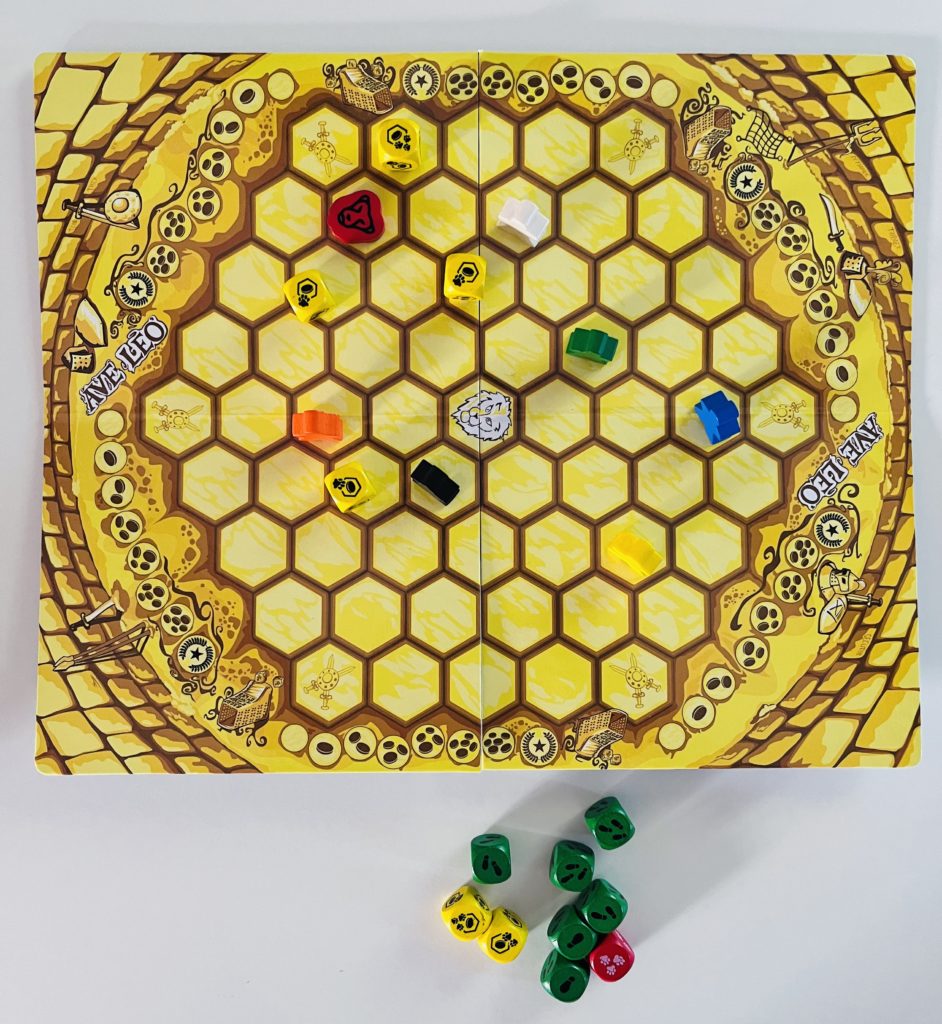 Ave Léo est avant tout un jeu de stratégie abstrait. La thématisation autour des combats de gladiateurs est très légère et donc vite oubliée. Le plateau de jeu est un hexagone, lui-même divisé en 61 hexagones. Un pion représentant le lion est placé au centre, et les gladiateurs (de 2 à 6) sur des emplacements précis au bord du plateau. L’objectif est de récolter en premier 7 pièces d’or représentées par des 6 dés jaunes. Le joueur actif lance le dé rouge ainsi que 4 ou 6 dés vert. Chacun son tour, et jusqu’à épuisement du stock de dés, on va en récupérer un et réaliser son effet. Le dé rouge permet de bouger le lion de 1 à 3 cases. Les dés verts vont avancer le pion du joueur de 1 à 3 cases dans la même direction. Mais attention car être adjacent au lion ou à un adversaire consomme un déplacement supplémentaire. L’objectif est d’atteindre un dé jaune afin de récupérer une pièce d’or. Le dé jaune est alors enlevé et il devra être lancé avec les autres au prochain jet. Quand un joueur le choisira, il devra le placer de 1 à 3 cases du lion.