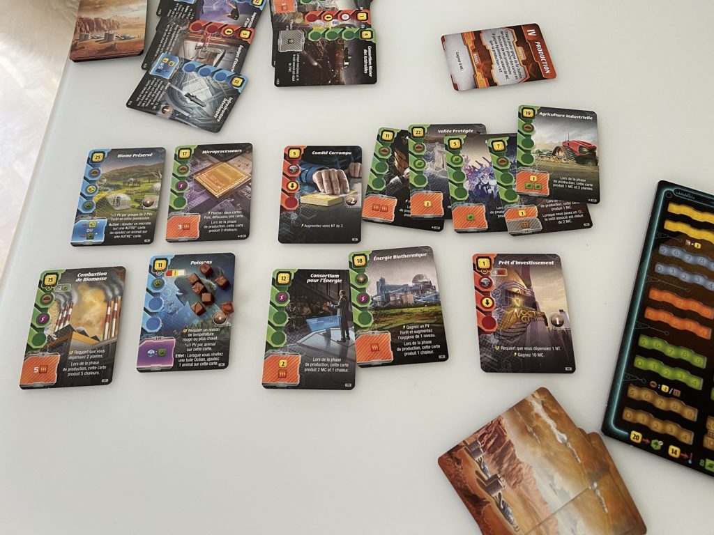 Ce n’est pas pour rien qu’Expédition Ares porte le nom de Terraforming Mars! Les 2 jeux sont fort similaires, dans le thème, dans les mécaniques et dans les cartes! Tout joueur du jeu d’origine se sentira en milieu connu avec ces cartes qui augmenteront les productions de ressources, avec les symboles sur les cartes, leurs effets, l’échelle de NT qui apporte PVs et production de mégacrédits, la plantation de forêt, l’étendue des océans et la montée de la température. Tout ça est du connu et comme c’est du connu très bon, c’est tant mieux 🙂