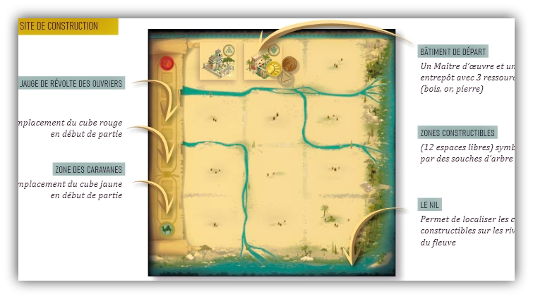 Chaque joueur possède un plateau personnel représentant un site de construction de 3X4 cases bordées sur la partie droite par le Nil. Ces zones serviront à construire 3 types de bâtiments : Productions, Administratifs et Principaux.