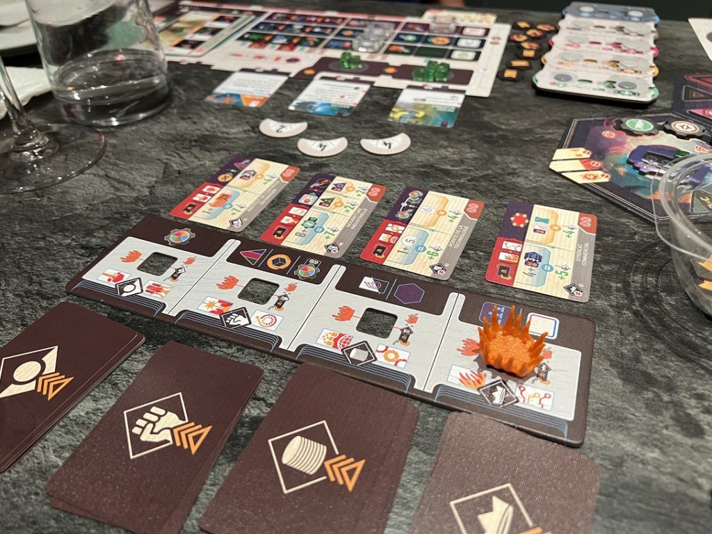Ensuite, justement les temps morts. Attendez-vous à un temps mort plus important en début de chaque manche. En effet, on va jouer 4 à 6 cartes sur la manche et une planification est nécessaire. Du coup, le premier joueur va bloquer la partie jusqu’à avoir une idée +/- précise de ses actions de la manche! Aux autres joueurs d’en profiter pour faire de même!