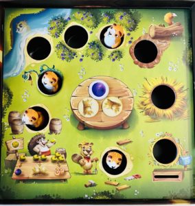 Si le matériel est important pour beaucoup de joueurs, il l’est encore plus quand le titre s’adresse à des enfants. En effet, ces derniers ont besoin de manipuler pour rester attentifs. Fluffy Valley fait un sans-faute à ce niveau et les enfants sont immédiatement attirés par le jeu. La boîte qui est également le plateau, se compose de neuf emplacements dans lesquels on pose des figurines représentant des chiens de prairie, pour y exécuter l’action associée. L’objectif est de réunir, de manière collective, les ressources demandées avant l’arrivée de l’hiver afin que ces adorables animaux passent un hiver douillet dans leur terrier. La cerise sur le gâteau au niveau de l’édition est le remplissage du terrier. Quand on fait l’action de remplir le terrier, on prend toutes les ressources du même type en notre possession, que l’on insère dans une fente du plateau pour qu’elles glissent dans le terrier. Succès garanti ! Ce qui pose tout de même un problème de taille puisque tous les petits joueurs veulent réaliser cette action !